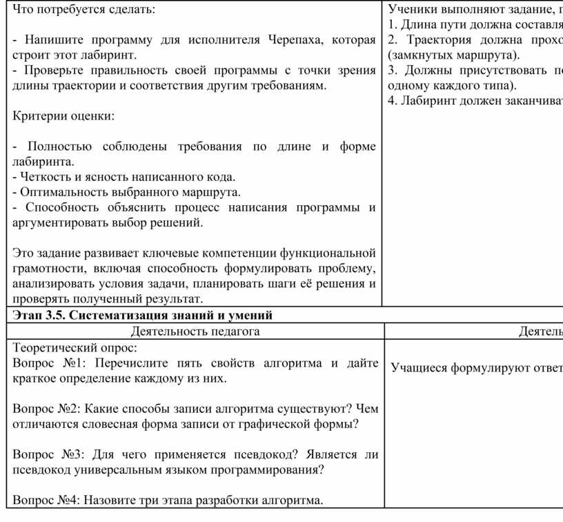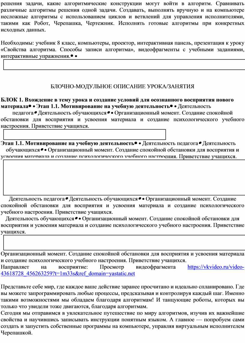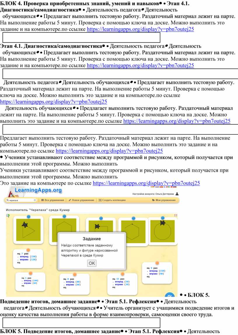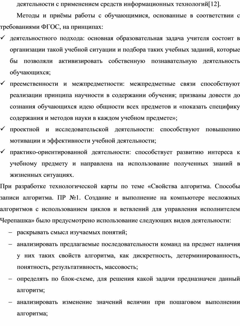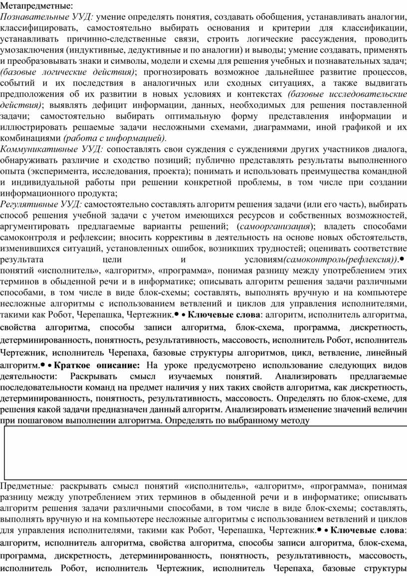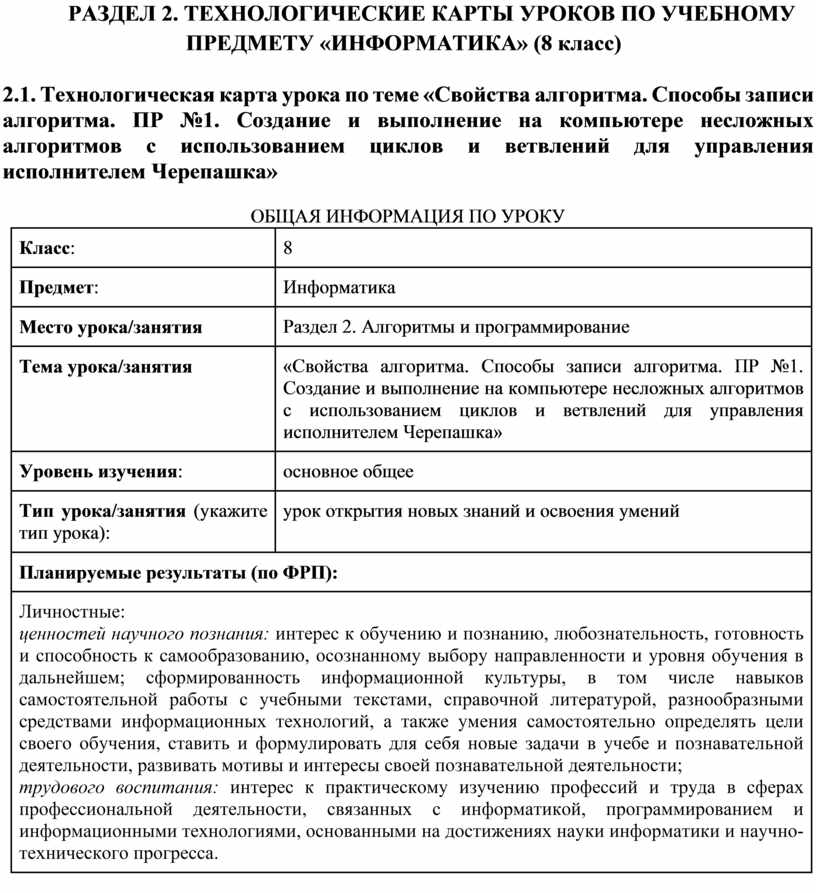 2.1. Технологическая карта урока по теме «Свойства алгоритма. Способы записи алгоритма. ПР №1. Создание и выполнение на компьютере несложных алгоритмов с использованием циклов и ветвлений для управления исполнителем Черепашка»