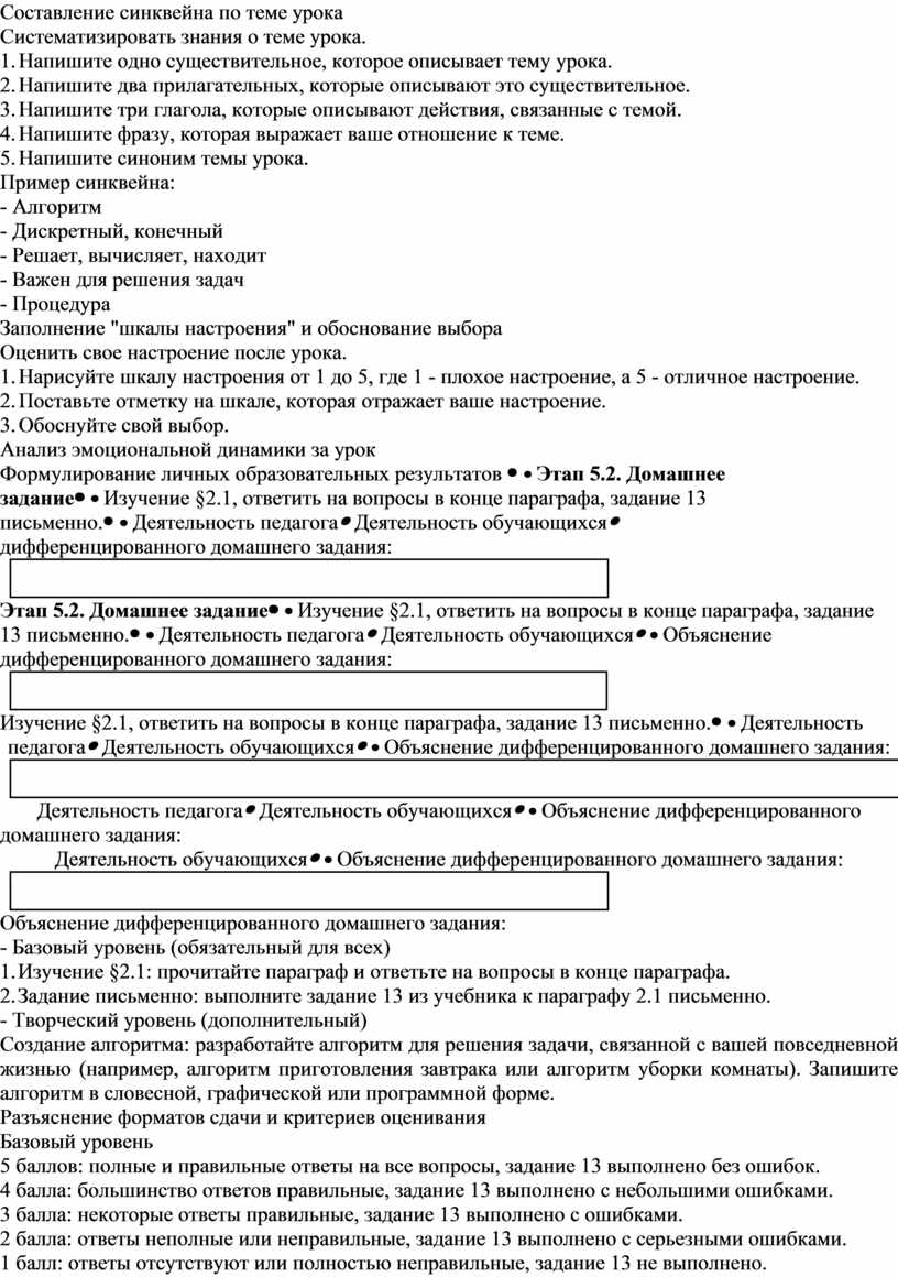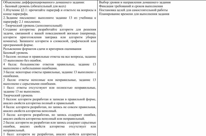 Объяснение дифференцированного домашнего задания: - Базовый уровень (обязательный для всех) 1. Изучение §2.1: прочитайте параграф и ответьте на вопросы в конце параграфа. 2. Задание письменно: выполните задание 13 из учебника к параграфу 2.1 письменно. - Творческий уровень (дополнительный) Создание алгоритма: разработайте алгоритм для решения задачи, связанной с вашей повседневной жизнью (например, алгоритм приготовления завтрака или алгоритм уборки комнаты). Запишите алгоритм в словесной, графической или программной форме. Разъяснение форматов сдачи и критериев оценивания Базовый уровень 5 баллов: полные и правильные ответы на все вопросы, задание 13 выполнено без ошибок. 4 балла: большинство ответов правильные, задание 13 выполнено с небольшими ошибками. 3 балла: некоторые ответы правильные, задание 13 выполнено с ошибками. 2 балла: ответы неполные или неправильные, задание 13 выполнено с серьезными ошибками. 1 балл: ответы отсутствуют или полностью неправильные, задание 13 не выполнено. Творческий уровень 5 баллов: алгоритм разработан и записан в правильной форме, анализ свойств алгоритма полный и правильный. 4 балла: алгоритм разработан, но запись не совсем правильная, анализ свойств алгоритма неполный. 3 балла: алгоритм разработан, но запись содержит ошибки, анализ свойств алгоритма неполный или неправильный. 2 балла: алгоритм не разработан или запись содержит серьезные ошибки, анализ свойств алгоритма отсутствует или неправильный. 1 балл: алгоритм не разработан, анализ свойств алгоритма отсутствует. |