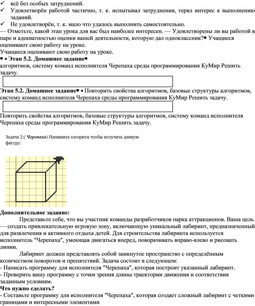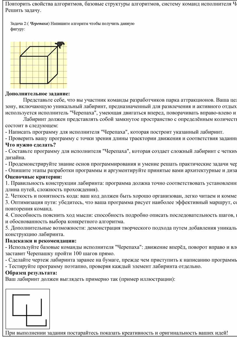 Дополнительное задание: Представьте себе, что вы участник команды разработчиков парка аттракционов. Ваша цель — создать привлекательную игровую зону, включающую уникальный лабиринт, предназначенный для развлечения и активного отдыха детей. Для строительства лабиринта используется исполнитель "Черепаха", умеющая двигаться вперед, поворачивать вправо-влево и рисовать линии. Лабиринт должен представлять собой замкнутое пространство с определённым количеством поворотов и препятствий. Задача состоит в следующем: - Написать программу для исполнителя "Черепаха", которая построит указанный лабиринт. - Проверить вашу программу с точки зрения длины траектории движения и соответствия заданным условиям. Что нужно сделать? - Составьте программу для исполнителя "Черепаха", которая создает сложный лабиринт с четкими границами и интересными элементами дизайна. - Продемонстрируйте знание основ программирования и умение решать практические задачи через программирование. - Опишите этапы разработки программы и аргументируйте принятые вами архитектурные и дизайн-решения. Оценочные критерии: 1. Правильность конструкции лабиринта: программа должна точно соответствовать установленным требованиям (количество поворотов, длина путей, сложность прохождения). 2. Четкость и понятность кода: ваш код должен быть хорошо организован, легко читаем и комментирован. 3. Оптимизация пути: убедитесь, что ваша программа рисует наиболее эффективный маршрут, сокращая ненужные передвижения и повторения команд. 4. Способность пояснить ход мысли: способность подробно описать последовательность шагов, предпринятых при разработке лабиринта, и обоснованность выбора конкретного алгоритма. 5. Дополнительные возможности: демонстрация творческого подхода путем добавления уникальных особенностей и интересных деталей в конструкцию лабиринта. Подсказки и рекомендации: - Используйте базовые команды исполнителя "Черепаха": движение вперёд, поворот вправо и влево. Например, команда вперед(100) заставит Черепашку пройти 100 шагов прямо. - Сделайте чертеж лабиринта заранее на бумаге, прежде чем приступить к написанию программы. - Тестируйте программу поэтапно, проверяя каждый элемент лабиринта отдельно. Образец результата: Ваш лабиринт должен выглядеть примерно так (пример иллюстрации):