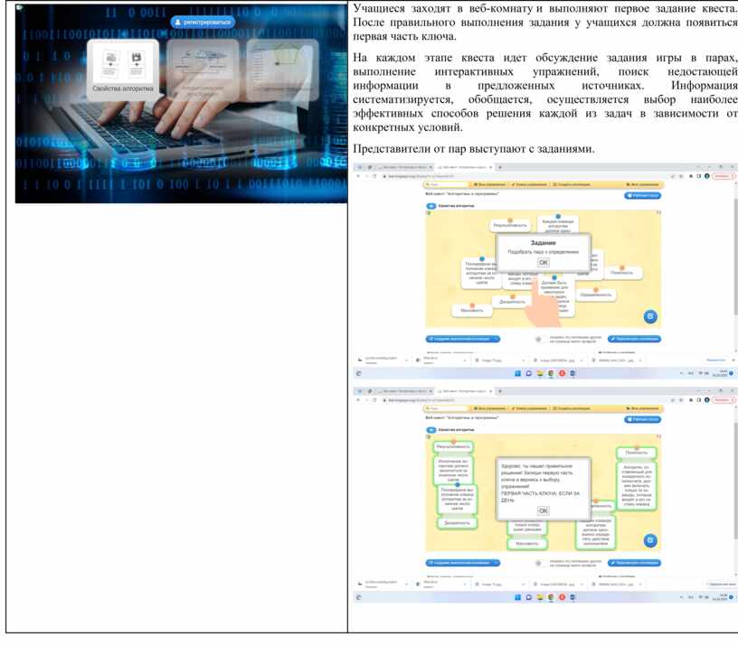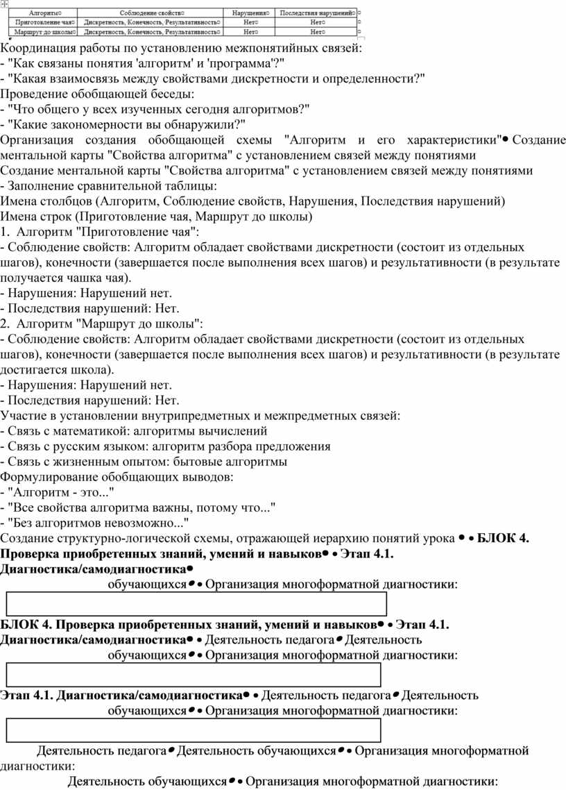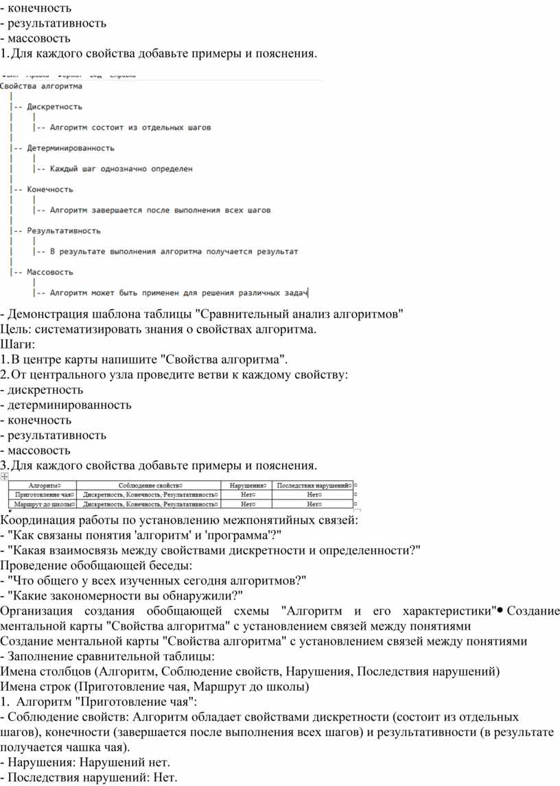 Создание ментальной карты "Свойства алгоритма" с установлением связей между понятиями - Заполнение сравнительной таблицы: Имена столбцов (Алгоритм, Соблюдение свойств, Нарушения, Последствия нарушений) Имена строк (Приготовление чая, Маршрут до школы) 1. Алгоритм "Приготовление чая": - Соблюдение свойств: Алгоритм обладает свойствами дискретности (состоит из отдельных шагов), конечности (завершается после выполнения всех шагов) и результативности (в результате получается чашка чая). - Нарушения: Нарушений нет. - Последствия нарушений: Нет. 2. Алгоритм "Маршрут до школы": - Соблюдение свойств: Алгоритм обладает свойствами дискретности (состоит из отдельных шагов), конечности (завершается после выполнения всех шагов) и результативности (в результате достигается школа). - Нарушения: Нарушений нет. - Последствия нарушений: Нет. Участие в установлении внутрипредметных и межпредметных связей: - Связь с математикой: алгоритмы вычислений - Связь с русским языком: алгоритм разбора предложения - Связь с жизненным опытом: бытовые алгоритмы Формулирование обобщающих выводов: - "Алгоритм - это..." - "Все свойства алгоритма важны, потому что..." - "Без алгоритмов невозможно..." Создание структурно-логической схемы, отражающей иерархию понятий урока |