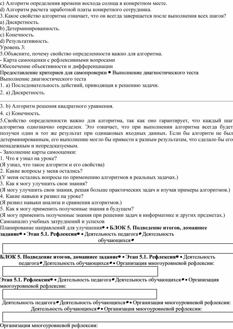 Выполнение диагностического теста 1. a) Последовательность действий, приводящая к решению задачи. 2. a) Дискретность. 3. b) Алгоритм решения квадратного уравнения. 4. c) Конечность. 5.Свойство определенности важно для алгоритма, так как оно гарантирует, что каждый шаг алгоритма однозначно определен. Это означает, что при выполнении алгоритма всегда будет получен один и тот же результат при одинаковых входных данных. Если бы алгоритм не был детерминированным, его выполнение могло бы привести к разным результатам, что сделало бы его ненадежным и непредсказуемым. - Заполнение карты самооценки: 1. Что я узнал на уроке? (Я узнал, что такое алгоритм и его свойства) 2. Какие вопросы у меня остались? (У меня остались вопросы по применению алгоритмов в реальных задачах.) 3. Как я могу улучшить свои знания? (Я могу улучшить свои знания, решая больше практических задач и изучая примеры алгоритмов.) 4. Какие навыки я развил на уроке? (Я развил навыки анализа и сравнения алгоритмов.) 5. Как я могу применить полученные знания в будущем? (Я могу применить полученные знания при решении задач в информатике и других предметах.) Самоанализ учебных затруднений и успехов Планирование направлений для улучшения |
