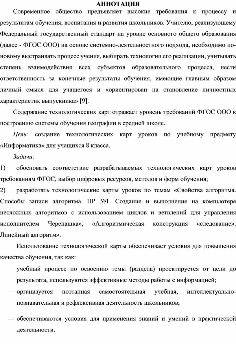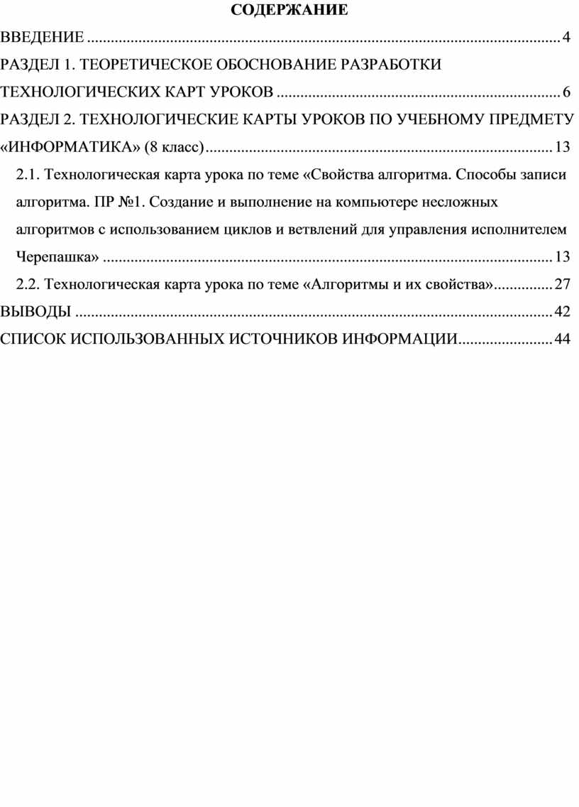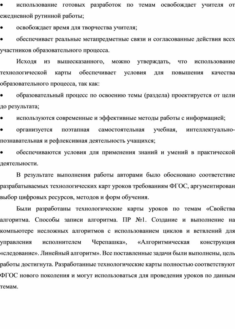 Были разработаны технологические карты уроков по темам «Свойства алгоритма. Способы записи алгоритма. ПР №1. Создание и выполнение на компьютере несложных алгоритмов с использованием циклов и ветвлений для управления исполнителем Черепашка», «Алгоритмическая конструкция «следование». Линейный алгоритм». Все поставленные задачи были выполнены, цель работы достигнута. Разработанные технологические карты полностью соответствуют ФГОС нового поколения и могут использоваться для проведения уроков по данным темам.