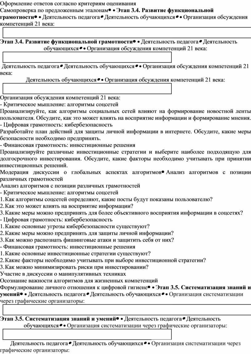 Организация обсуждения компетенций 21 века: - Критическое мышление: алгоритмы соцсетей Проанализируйте, как алгоритмы социальных сетей влияют на формирование новостной ленты пользователя. Обсудите, как это может влиять на восприятие информации и формирование мнения. - Цифровая грамотность: кибербезопасность Разработайте план действий для защиты личной информации в интернете. Обсудите, какие меры безопасности необходимо предпринять. - Финансовая грамотность: инвестиционные решения Проанализируйте различные инвестиционные стратегии и выберите наиболее подходящую для долгосрочного инвестирования. Обсудите, какие факторы необходимо учитывать при принятии инвестиционных решений. Модерация дискуссии о глобальных аспектах алгоритмов |