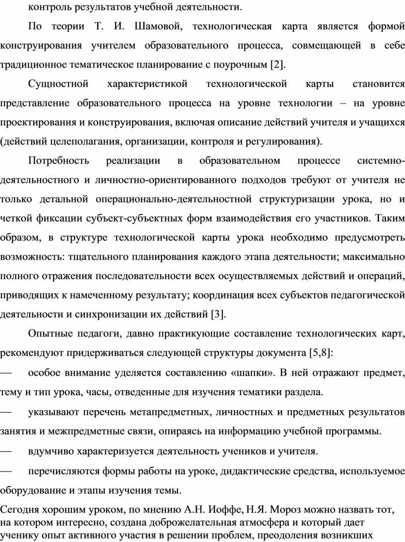 По теории Т. И. Шамовой, технологическая карта является формой конструирования учителем образовательного процесса, совмещающей в себе традиционное тематическое планирование с поурочным [2].