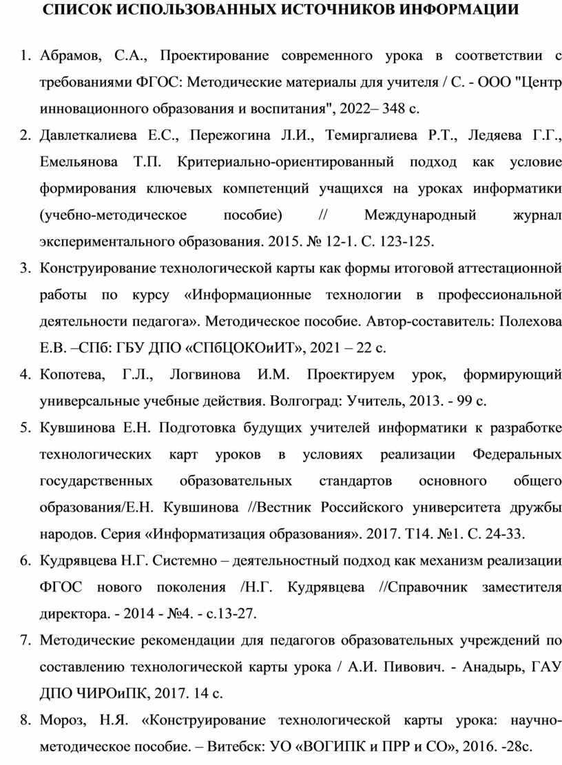 1. Абрамов, С.А., Проектирование современного урока в соответствии с требованиями ФГОС: Методические материалы для учителя / С. - ООО "Центр инновационного образования и воспитания", 2022– 348 с.