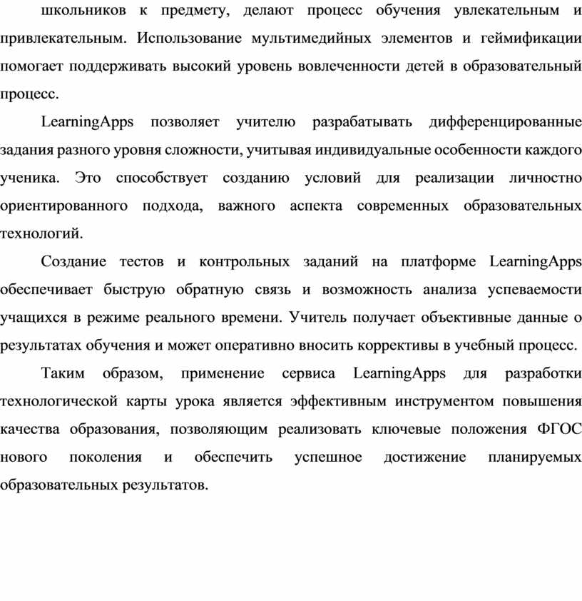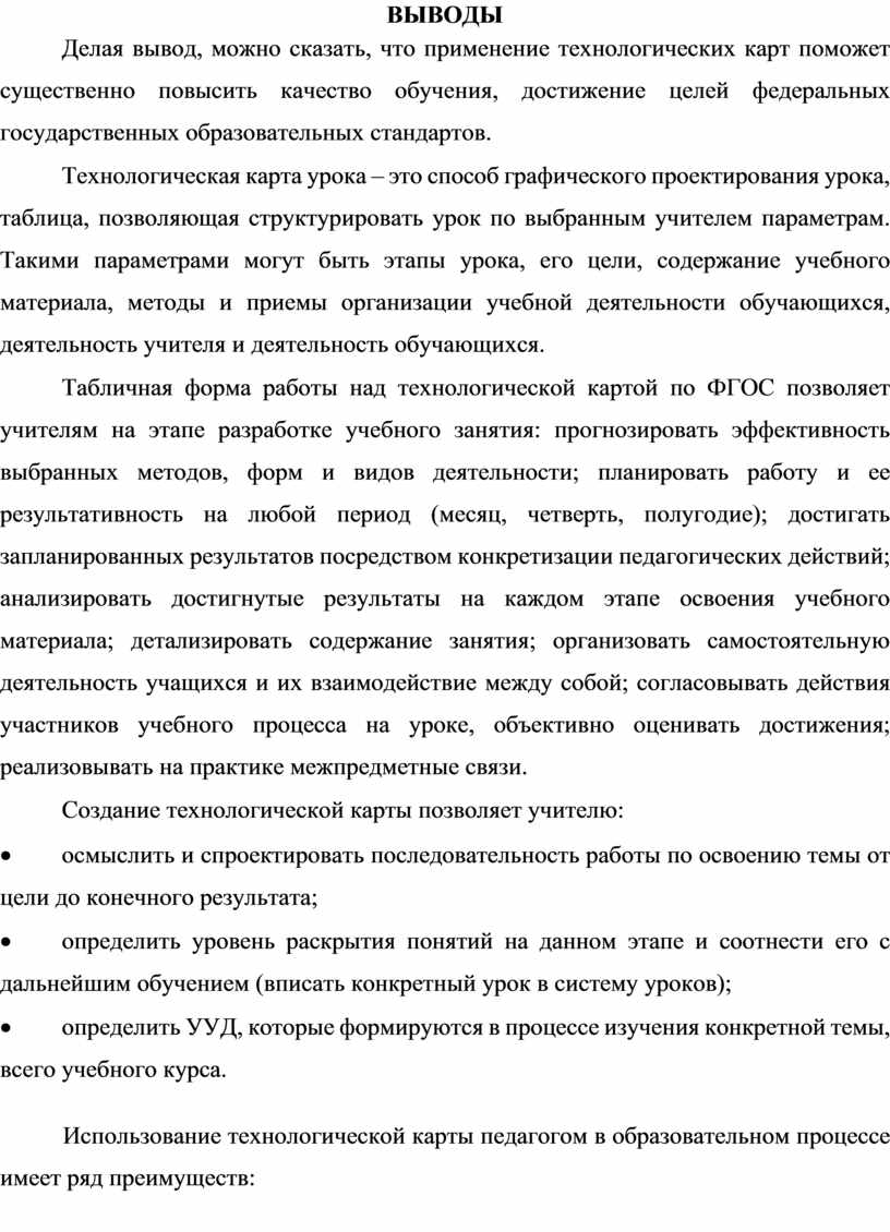 Делая вывод, можно сказать, что применение технологических карт поможет существенно повысить качество обучения, достижение целей федеральных государственных образовательных стандартов.