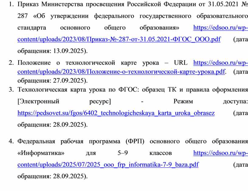 9. Приказ Министерства просвещения Российской Федерации от 31.05.2021 № 287 «Об утверждении федерального государственного образовательного стандарта основного общего образования» https://edsoo.ru/wp-content/uploads/2023/08/Приказ-№-287-от-31.05.2021-ФГОС_ООО.pdf (дата обращения: 13.09.2025).
