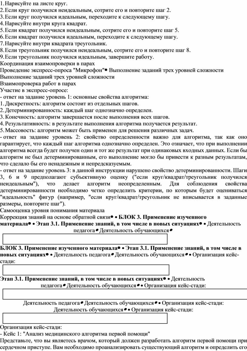Организация кейс-стади: - Кейс 1: "Анализ медицинского алгоритма первой помощи" Представьте, что вы являетесь врачом, который должен разработать алгоритм первой помощи при сердечном приступе. Вам необходимо проанализировать существующий алгоритм и определить его свойства. Задача: проанализируйте алгоритм первой помощи при сердечном приступе и определите, какие свойства алгоритма он демонстрирует. Предложите улучшения, если это необходимо. Пример алгоритма: 1. Оцените состояние пациента: o Если пациент в сознании, переходите к следующему шагу. o Если пациент без сознания, немедленно вызовите скорую помощь. 2. Проверьте дыхание и пульс: o Если дыхание и пульс есть, переходите к следующему шагу. o Если дыхания и пульса нет, начните сердечно-легочную реанимацию (СЛР). 3. Если пациент в сознании и дышит, помогите ему принять удобное положение и обеспечьте доступ свежего воздуха. 4. Если пациент без сознания, но дышит, положите его на бок и обеспечьте доступ свежего воздуха. 5. Продолжайте наблюдение за пациентом до прибытия скорой помощи. - Кейс 2: "Исследование алгоритма работы банкомата" Представьте, что вы являетесь инженером, который должен проанализировать алгоритм работы банкомата. Вам необходимо определить, какие свойства алгоритма он демонстрирует, и предложить улучшения. Задача: проанализируйте алгоритм работы банкомата и определите, какие свойства алгоритма он демонстрирует. Предложите улучшения, если это необходимо. Пример алгоритма: 1. Вставьте карту в банкомат. 2. Введите PIN-код. 3. Выберите операцию (снятие наличных, проверка баланса, перевод средств). 4. Если выбрано снятие наличных: o укажите сумму. o подтвердите операцию. o банкомат выдаст наличные и чек. 5. Если выбрано проверка баланса: o банкомат покажет баланс на экране. 6. Если выбрано перевод средств: o введите номер счета получателя. o укажите сумму. o подтвердите операцию. 7. Завершите работу с банкоматом, забрав карту и чек. Формулировка критериев анализа Модерация обсуждения практических выводов |