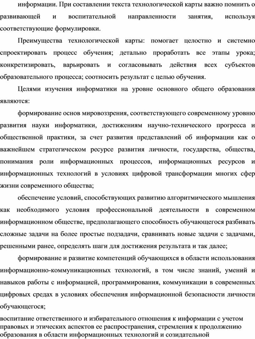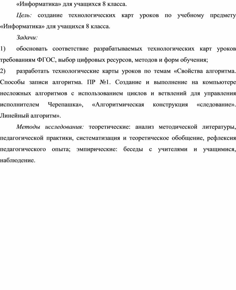 Цель: создание технологических карт уроков по учебному предмету «Информатика» для учащихся 8 класса.