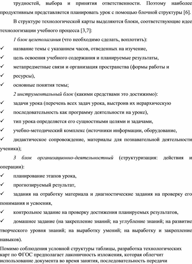 Технологическая карта урока представляет собой графический вариант традиционного плана-конспекта, которой присущи интерактивность, структурированность, алгоритмичность при работе с информацией и технологичность. Использование технологической карты помогает целостно и системно спроектировать процесс обучения, максимально детально проработать все этапы урока, конкретизировать, варьировать и согласовывать действия всех субъектов образовательного процесса, организовывать самостоятельную деятельность, соотносить результат с целью обучения [11].