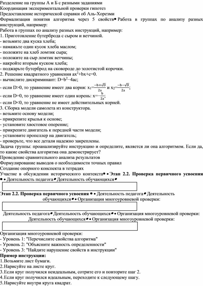 имеет один корень: x=− - если D<0, то уравнение не имеет действительных корней. 3. Сборка модели самолета из конструктора. - возьмите основу модели; - прикрепите крылья к основе; - установите хвостовое оперение; - прикрепите двигатель к передней части модели; - установите пропеллер на двигатель; - проверьте, что все детали надежно закреплены. Задача группы: проанализируйте инструкцию и определите, является ли она алгоритмом. Если да, то какие свойства алгоритма она демонстрирует? Проведение сравнительного анализа результатов Формулирование выводов о необходимости точных правил Создание опорного конспекта в тетрадях Участие в обсуждении исторического контекста |