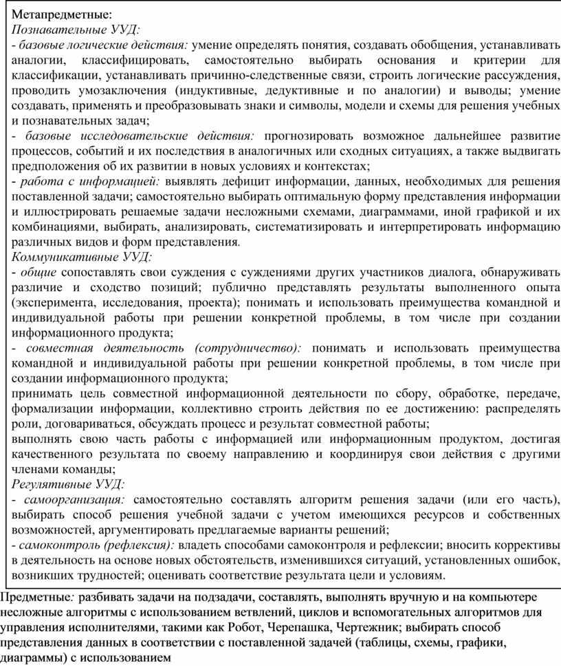 Предметные: разбивать задачи на подзадачи, составлять, выполнять вручную и на компьютере несложные алгоритмы с использованием ветвлений, циклов и вспомогательных алгоритмов для управления исполнителями, такими как Робот, Черепашка, Чертежник; выбирать способ представления данных в соответствии с поставленной задачей (таблицы, схемы, графики, диаграммы) с использованием соответствующих программных средств обработки данных, распознавать попытки и предупреждать вовлечение себя и окружающих в деструктивные и криминальные формы сетевой активности (в том числе кибербуллинг, фишинг) |