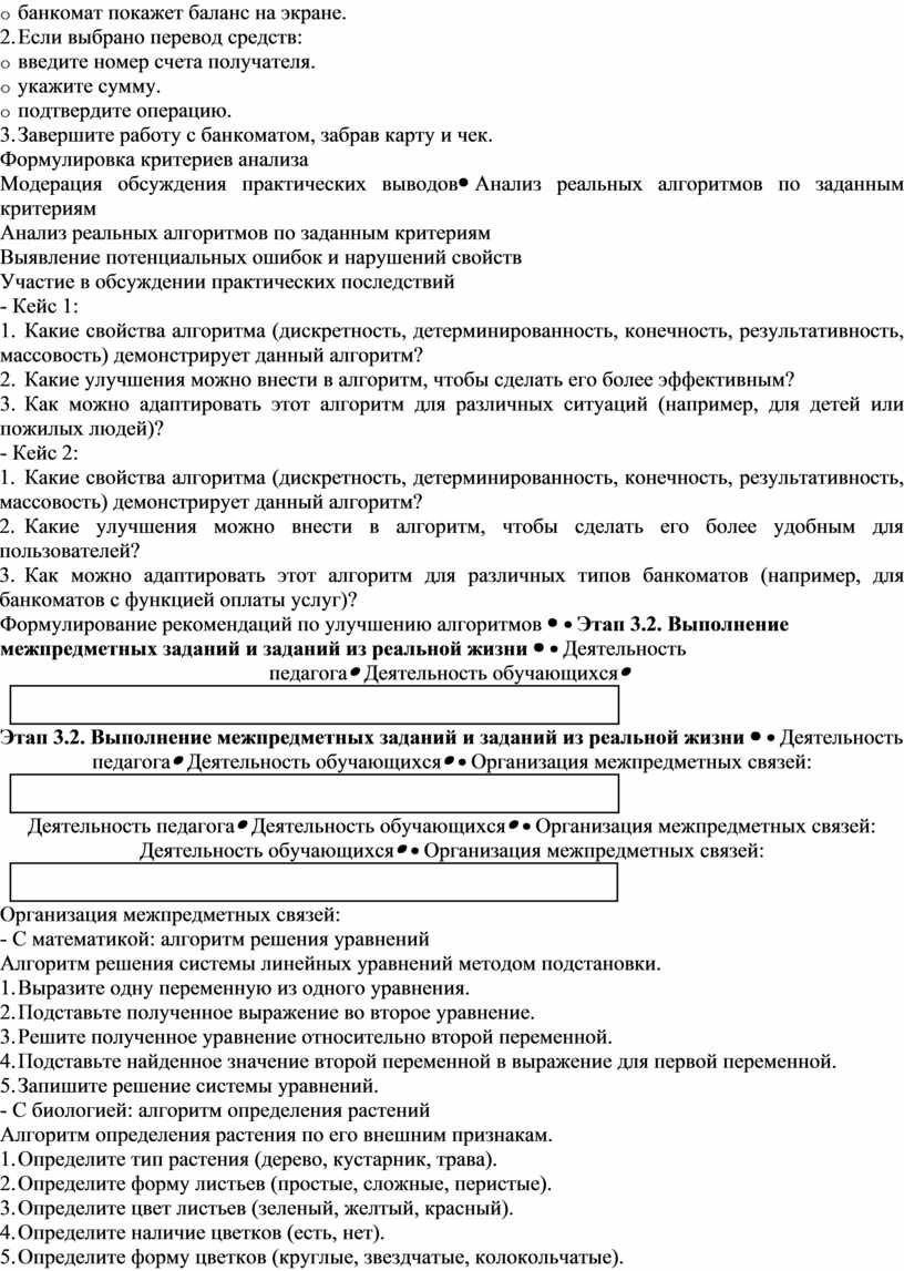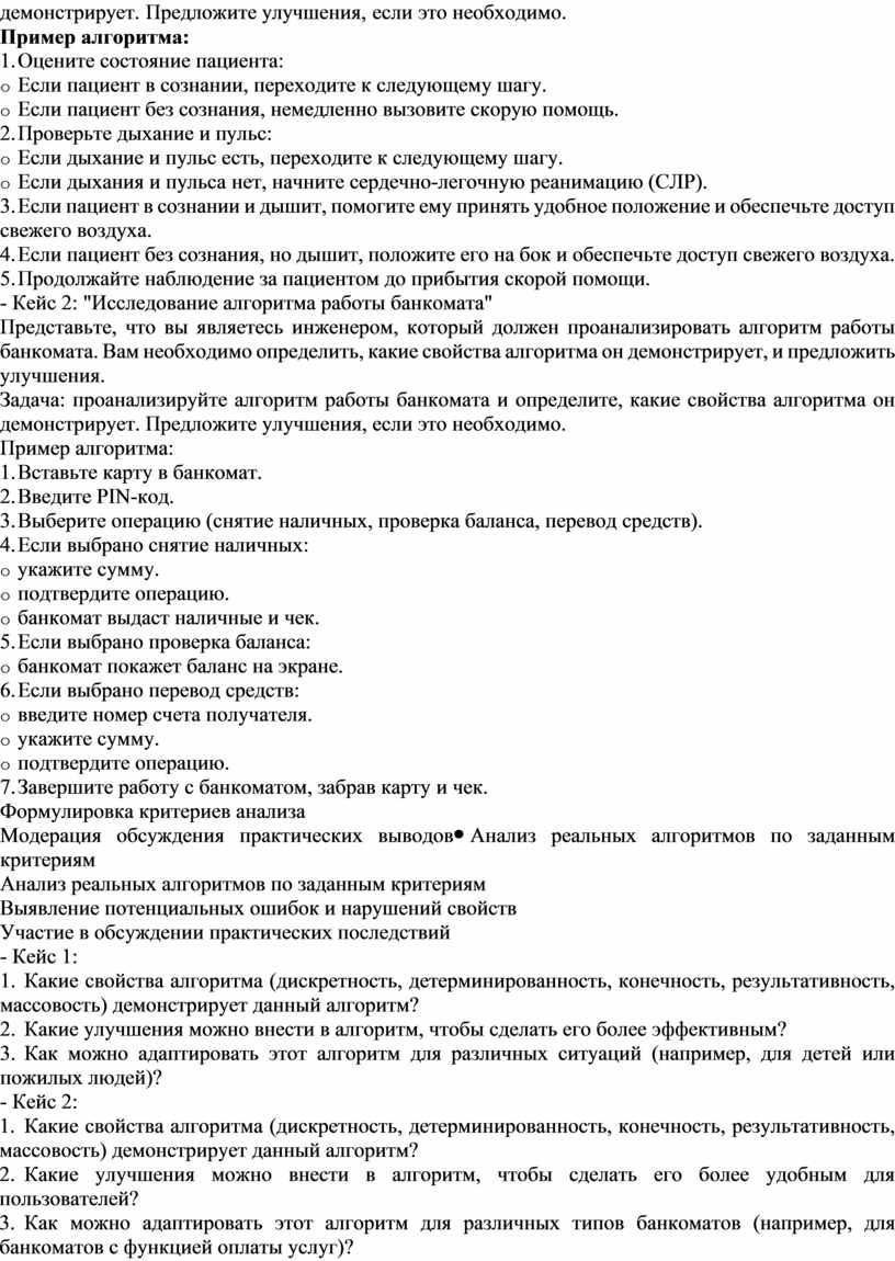 Анализ реальных алгоритмов по заданным критериям Выявление потенциальных ошибок и нарушений свойств Участие в обсуждении практических последствий - Кейс 1: 1. Какие свойства алгоритма (дискретность, детерминированность, конечность, результативность, массовость) демонстрирует данный алгоритм? 2. Какие улучшения можно внести в алгоритм, чтобы сделать его более эффективным? 3. Как можно адаптировать этот алгоритм для различных ситуаций (например, для детей или пожилых людей)? - Кейс 2: 1. Какие свойства алгоритма (дискретность, детерминированность, конечность, результативность, массовость) демонстрирует данный алгоритм? 2. Какие улучшения можно внести в алгоритм, чтобы сделать его более удобным для пользователей? 3. Как можно адаптировать этот алгоритм для различных типов банкоматов (например, для банкоматов с функцией оплаты услуг)? Формулирование рекомендаций по улучшению алгоритмов |