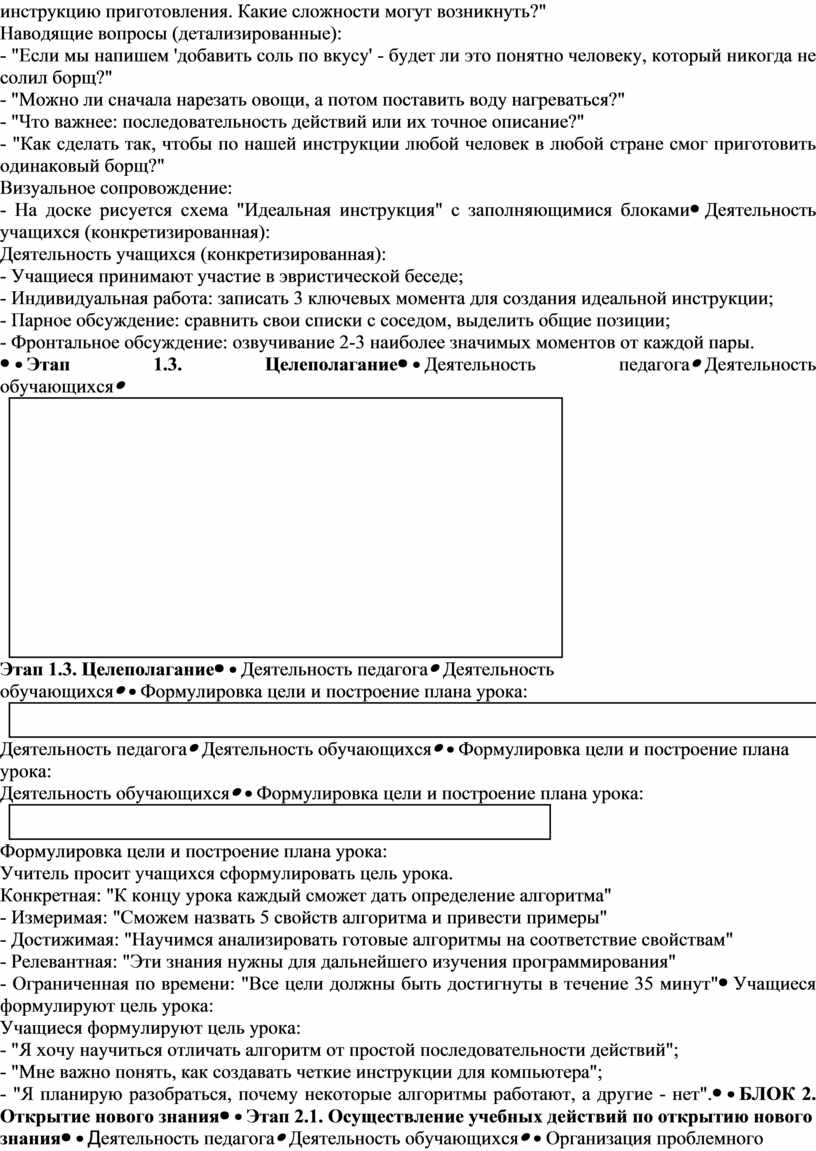 Создание проблемной ситуации через организацию эвристической беседы: "Представьте, что к вам в гости приехал друг из другой страны и никогда не видел, как готовят борщ. Ваша задача - составить для него максимально точную инструкцию приготовления. Какие сложности могут возникнуть?" Наводящие вопросы (детализированные): - "Если мы напишем 'добавить соль по вкусу' - будет ли это понятно человеку, который никогда не солил борщ?" - "Можно ли сначала нарезать овощи, а потом поставить воду нагреваться?" - "Что важнее: последовательность действий или их точное описание?" - "Как сделать так, чтобы по нашей инструкции любой человек в любой стране смог приготовить одинаковый борщ?" Визуальное сопровождение: - На доске рисуется схема "Идеальная инструкция" с заполняющимися блоками |