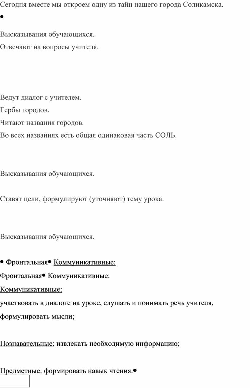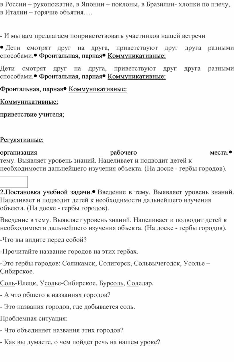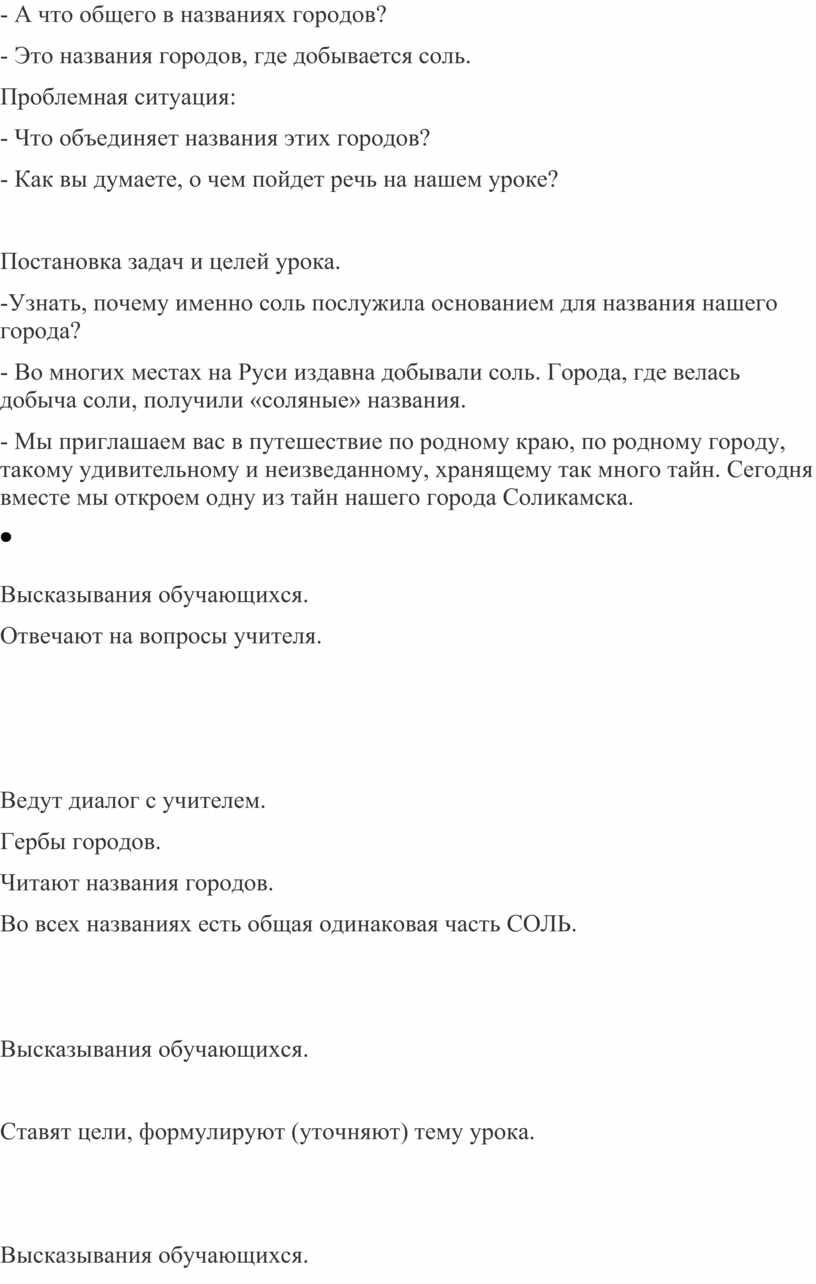 Введение в тему. Выявляет уровень знаний. Нацеливает и подводит детей к необходимости дальнейшего изучения объекта. (На доске - гербы городов). -Что вы видите перед собой? -Прочитайте название городов на этих гербах. -Это гербы городов: Соликамск, Солигорск, Сольвычегодск, Усолье – Сибирское. Соль-Илецк, Усолье-Сибирское, Бурсоль, Соледар. - А что общего в названиях городов? - Это названия городов, где добывается соль. Проблемная ситуация: - Что объединяет названия этих городов? - Как вы думаете, о чем пойдет речь на нашем уроке?