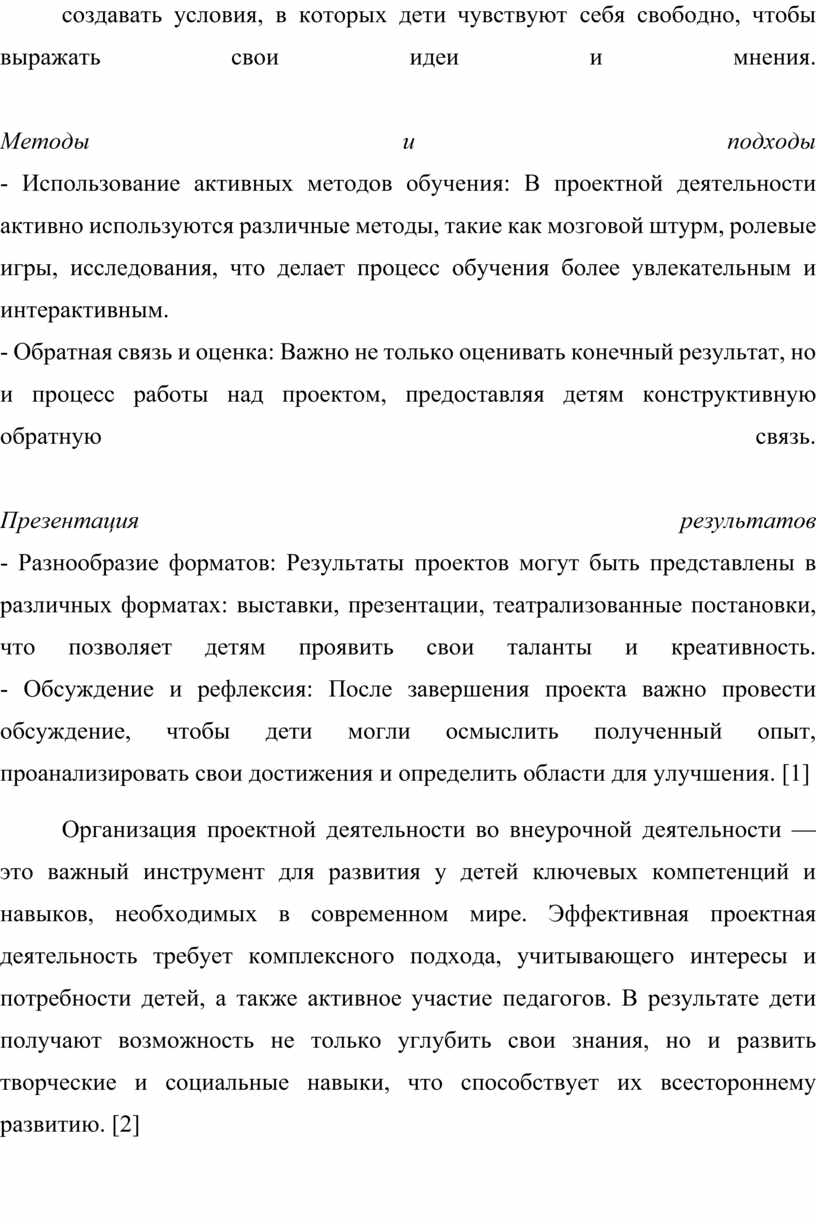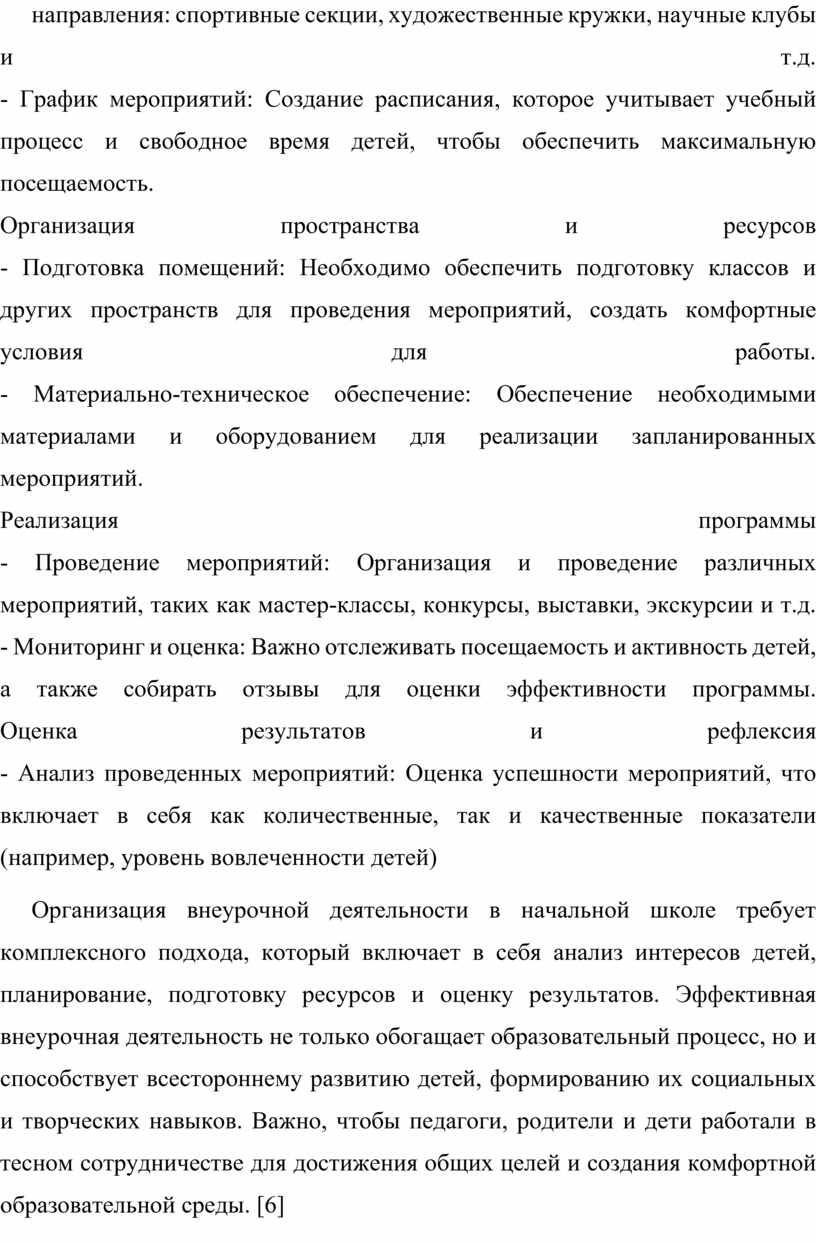 Организация внеурочной деятельности в начальной школе требует комплексного подхода, который включает в себя анализ интересов детей, планирование, подготовку ресурсов и оценку результатов. Эффективная внеурочная деятельность не только обогащает образовательный процесс, но и способствует всестороннему развитию детей, формированию их социальных и творческих навыков. Важно, чтобы педагоги, родители и дети работали в тесном сотрудничестве для достижения общих целей и создания комфортной образовательной среды. [6]