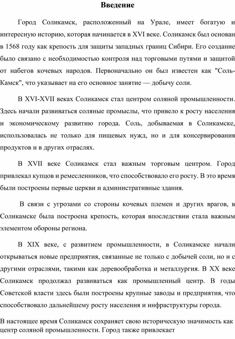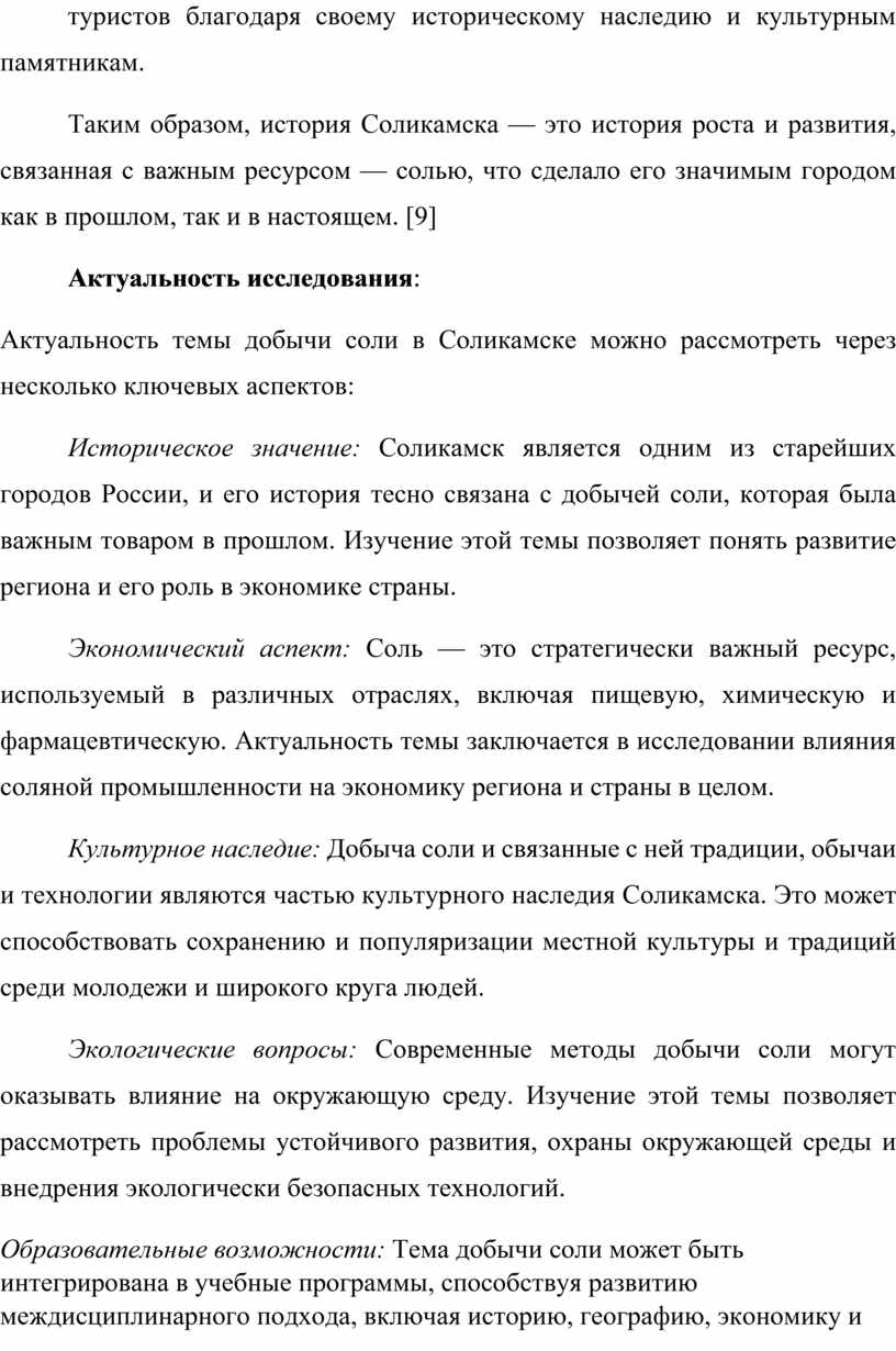 Таким образом, актуальность темы добычи соли в Соликамске охватывает исторические, экономические, культурные и экологические аспекты, что делает её важной для изучения и обсуждения в образовательных и научных кругах. [5]