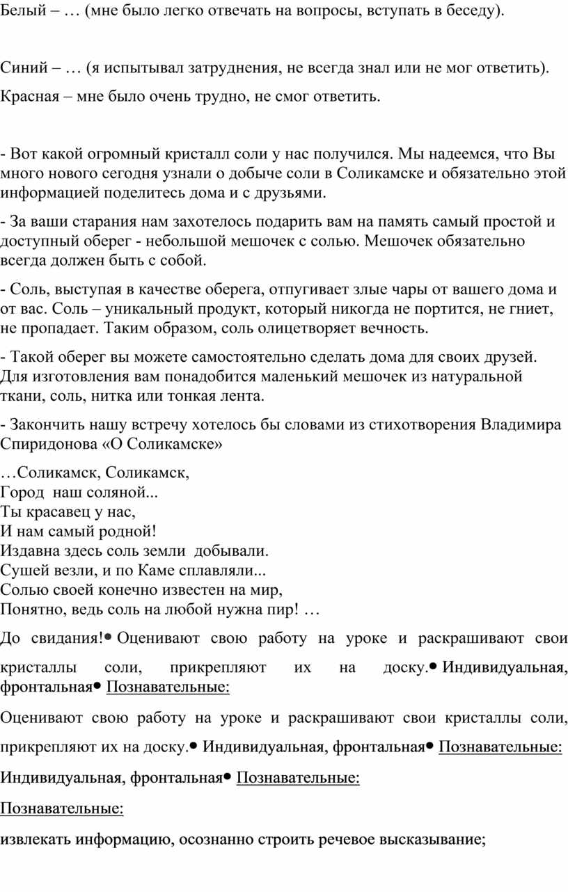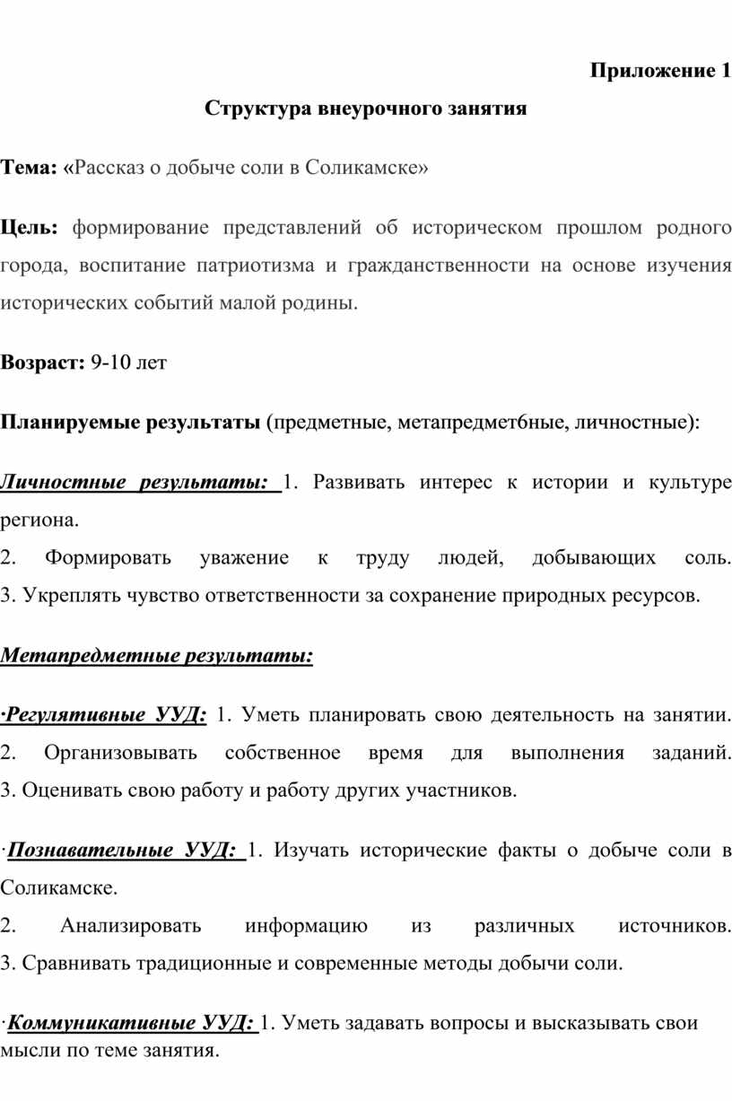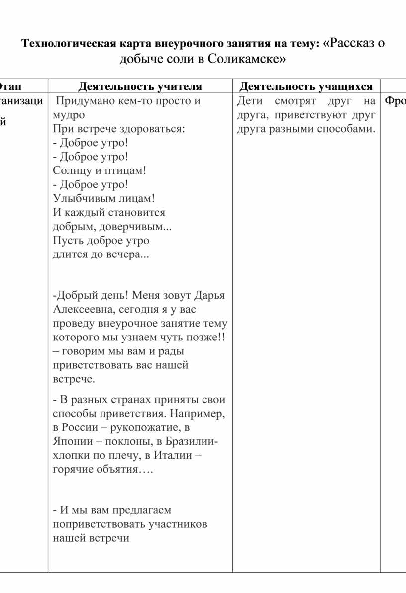 Технологическая карта внеурочного занятия на тему: «Рассказ о добыче соли в Соликамске»