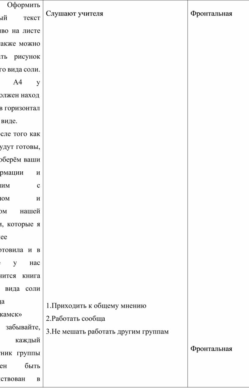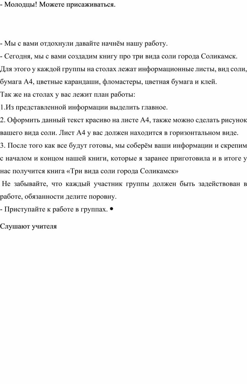 - Мы с вами отдохнули давайте начнём нашу работу. - Сегодня, мы с вами создадим книгу про три вида соли города Соликамск. Для этого у каждой группы на столах лежат информационные листы, вид соли, бумага А4, цветные карандаши, фломастеры, цветная бумага и клей. Так же на столах у вас лежит план работы: 1.Из представленной информации выделить главное. 2. Оформить данный текст красиво на листе А4, также можно сделать рисунок вашего вида соли. Лист А4 у вас должен находится в горизонтальном виде. 3. После того как все будут готовы, мы соберём ваши информации и скрепим с началом и концом нашей книги, которые я заранее приготовила и в итоге у нас получится книга «Три вида соли города Соликамск» Не забывайте, что каждый участник группы должен быть задействован в работе, обязанности делите поровну. - Приступайте к работе в группах. |