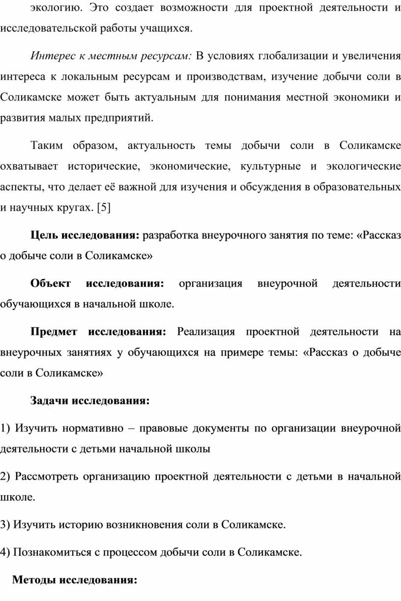 Предмет исследования: Реализация проектной деятельности на внеурочных занятиях у обучающихся на примере темы: «Рассказ о добыче соли в Соликамске»