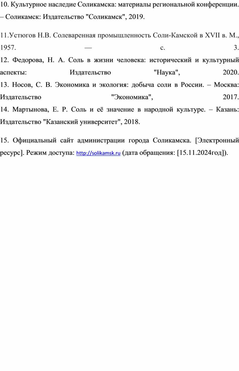 15. Официальный сайт администрации города Соликамска. [Электронный ресурс]. Режим доступа: http://solikamsk.ru (дата обращения: [15.11.2024год]).