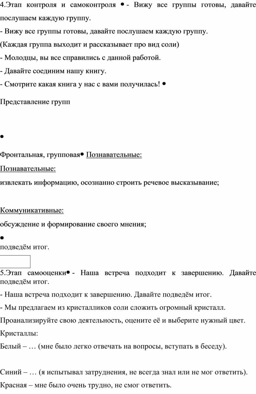 - Наша встреча подходит к завершению. Давайте подведём итог. - Мы предлагаем из кристалликов соли сложить огромный кристалл. Проанализируйте свою деятельность, оцените её и выберите нужный цвет. Кристаллы: Белый – … (мне было легко отвечать на вопросы, вступать в беседу).