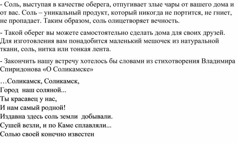 - Вот какой огромный кристалл соли у нас получился. Мы надеемся, что Вы много нового сегодня узнали о добыче соли в Соликамске и обязательно этой информацией поделитесь дома и с друзьями. - За ваши старания нам захотелось подарить вам на память самый простой и доступный оберег - небольшой мешочек с солью. Мешочек обязательно всегда должен быть с собой. - Соль, выступая в качестве оберега, отпугивает злые чары от вашего дома и от вас. Соль – уникальный продукт, который никогда не портится, не гниет, не пропадает. Таким образом, соль олицетворяет вечность. - Такой оберег вы можете самостоятельно сделать дома для своих друзей. Для изготовления вам понадобится маленький мешочек из натуральной ткани, соль, нитка или тонкая лента. - Закончить нашу встречу хотелось бы словами из стихотворения Владимира Спиридонова «О Соликамске» …Соликамск, Соликамск, До свидания! |