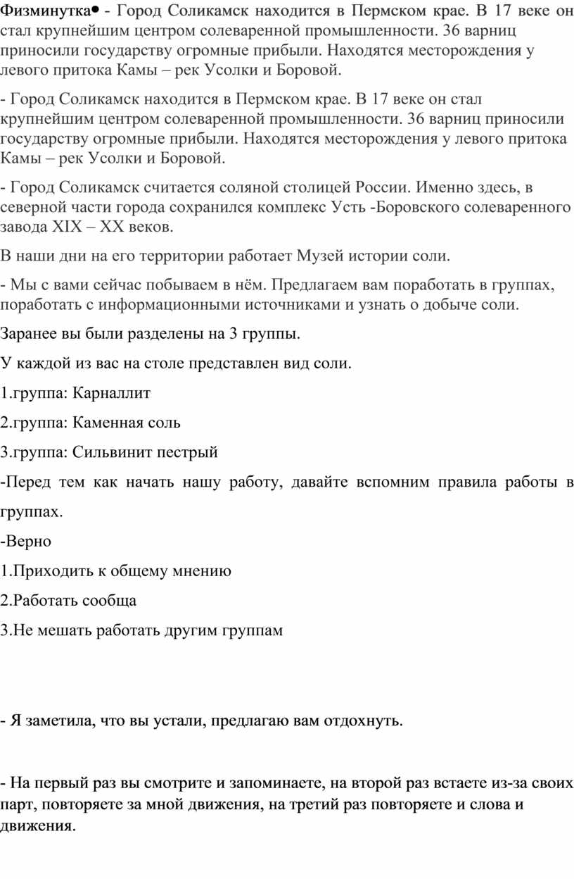 - Город Соликамск находится в Пермском крае. В 17 веке он стал крупнейшим центром солеваренной промышленности. 36 варниц приносили государству огромные прибыли. Находятся месторождения у левого притока Камы – рек Усолки и Боровой. - Город Соликамск считается соляной столицей России. Именно здесь, в северной части города сохранился комплекс Усть -Боровского солеваренного завода XIX – XX веков. В наши дни на его территории работает Музей истории соли. - Мы с вами сейчас побываем в нём. Предлагаем вам поработать в группах, поработать с информационными источниками и узнать о добыче соли. Заранее вы были разделены на 3 группы. У каждой из вас на столе представлен вид соли. 1.группа: Карналлит 2.группа: Каменная соль 3.группа: Сильвинит пестрый -Перед тем как начать нашу работу, давайте вспомним правила работы в группах. -Верно 1.Приходить к общему мнению 2.Работать сообща 3.Не мешать работать другим группам