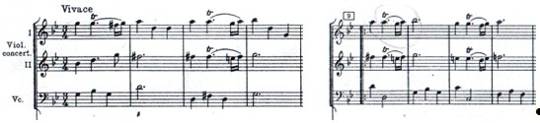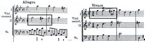 Во втором разделе этой части I и II скрипки ripieno играют вместе параллельными терциями более распевный мотив, а все остальные выполняют гармоническую и дублирующую роль.