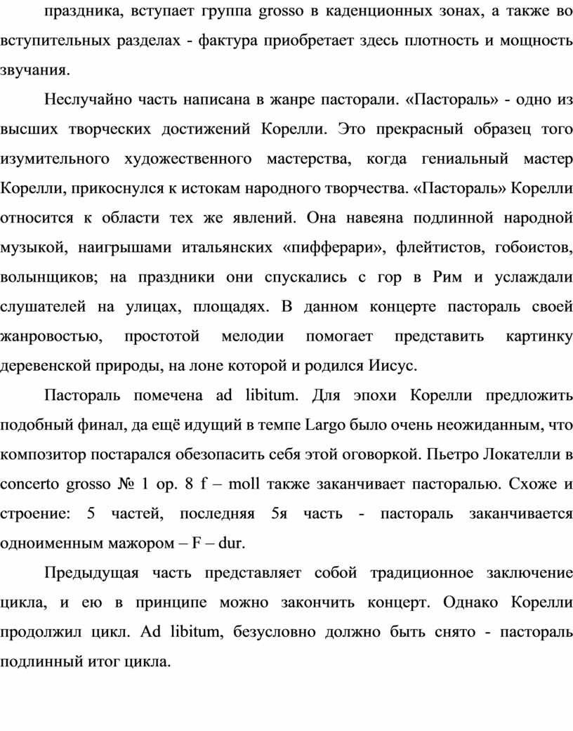 Пастораль помечена ad libitum. Для эпохи Корелли предложить подобный финал, да ещё идущий в темпе Largo было очень неожиданным, что композитор постарался обезопасить себя этой оговоркой. Пьетро Локателли в concerto grosso № 1 op. 8 f – moll также заканчивает пасторалью. Схоже и строение: 5 частей, последняя 5я часть - пастораль заканчивается одноименным мажором – F – dur.