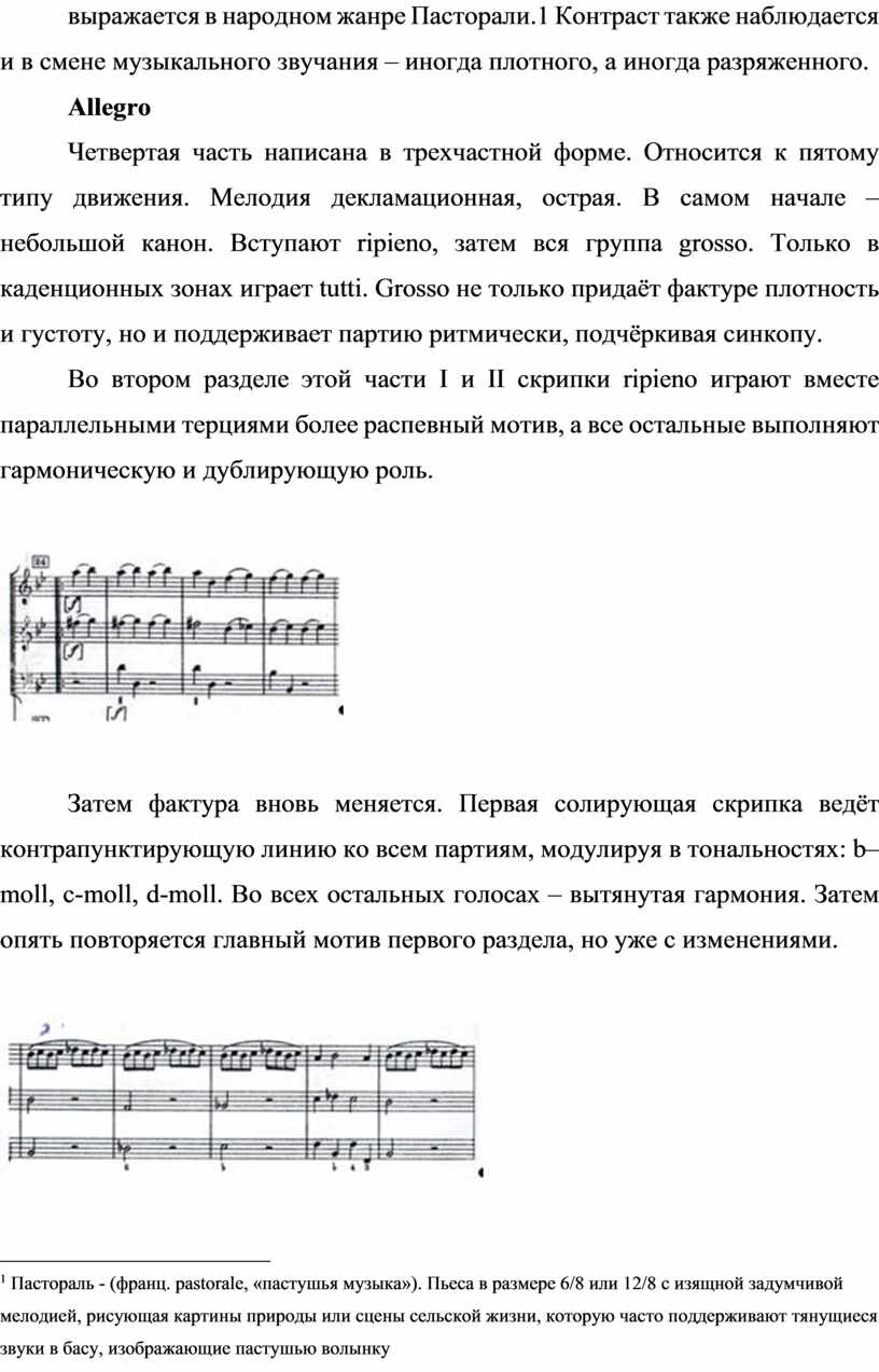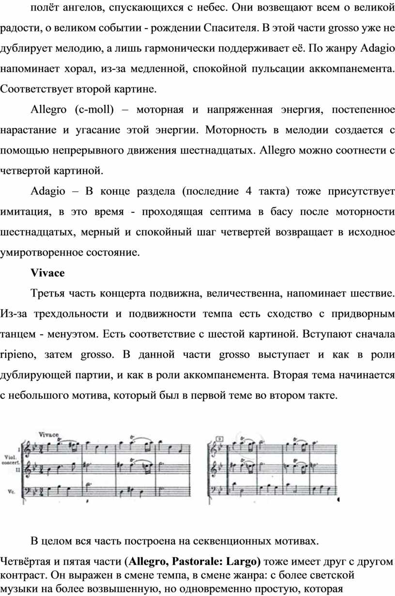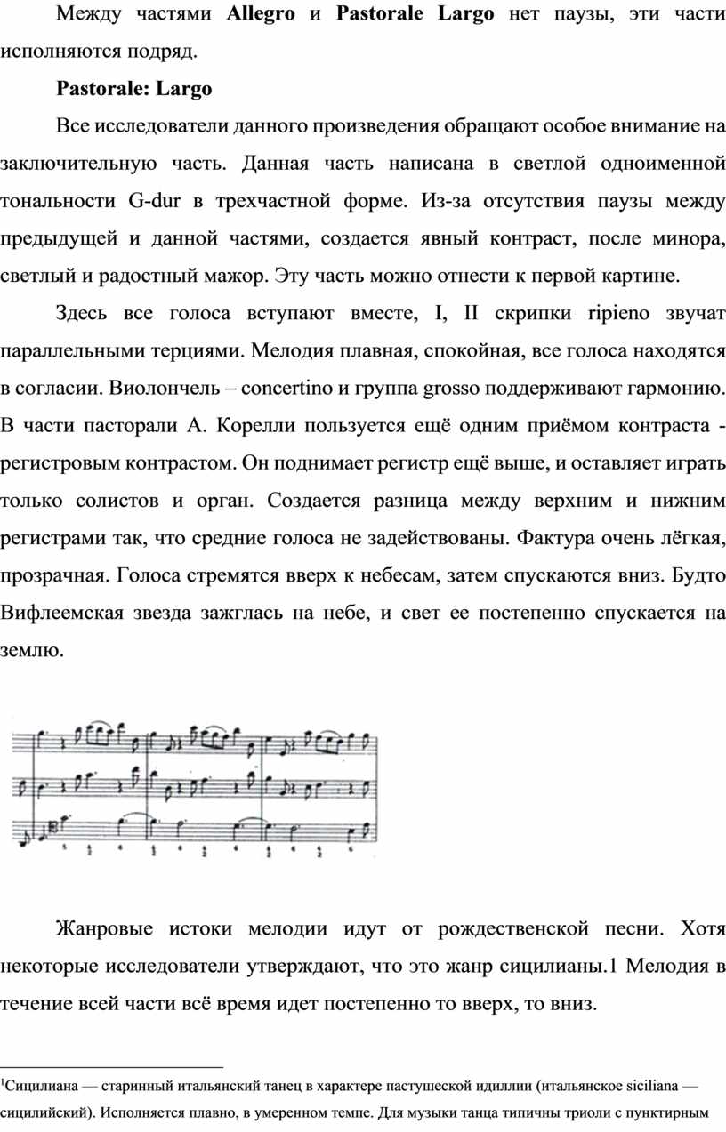 Неслучайно часть написана в жанре пасторали. «Пастораль» - одно из высших творческих достижений Корелли. Это прекрасный образец того изумительного художественного мастерства, когда гениальный мастер Корелли, прикоснулся к истокам народного творчества. «Пастораль» Корелли относится к области тех же явлений. Она навеяна подлинной народной музыкой, наигрышами итальянских «пифферари», флейтистов, гобоистов, волынщиков; на праздники они спускались с гор в Рим и услаждали слушателей на улицах, площадях. В данном концерте пастораль своей жанровостью, простотой мелодии помогает представить картинку деревенской природы, на лоне которой и родился Иисус.