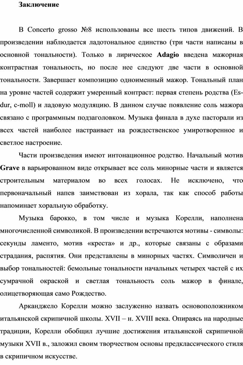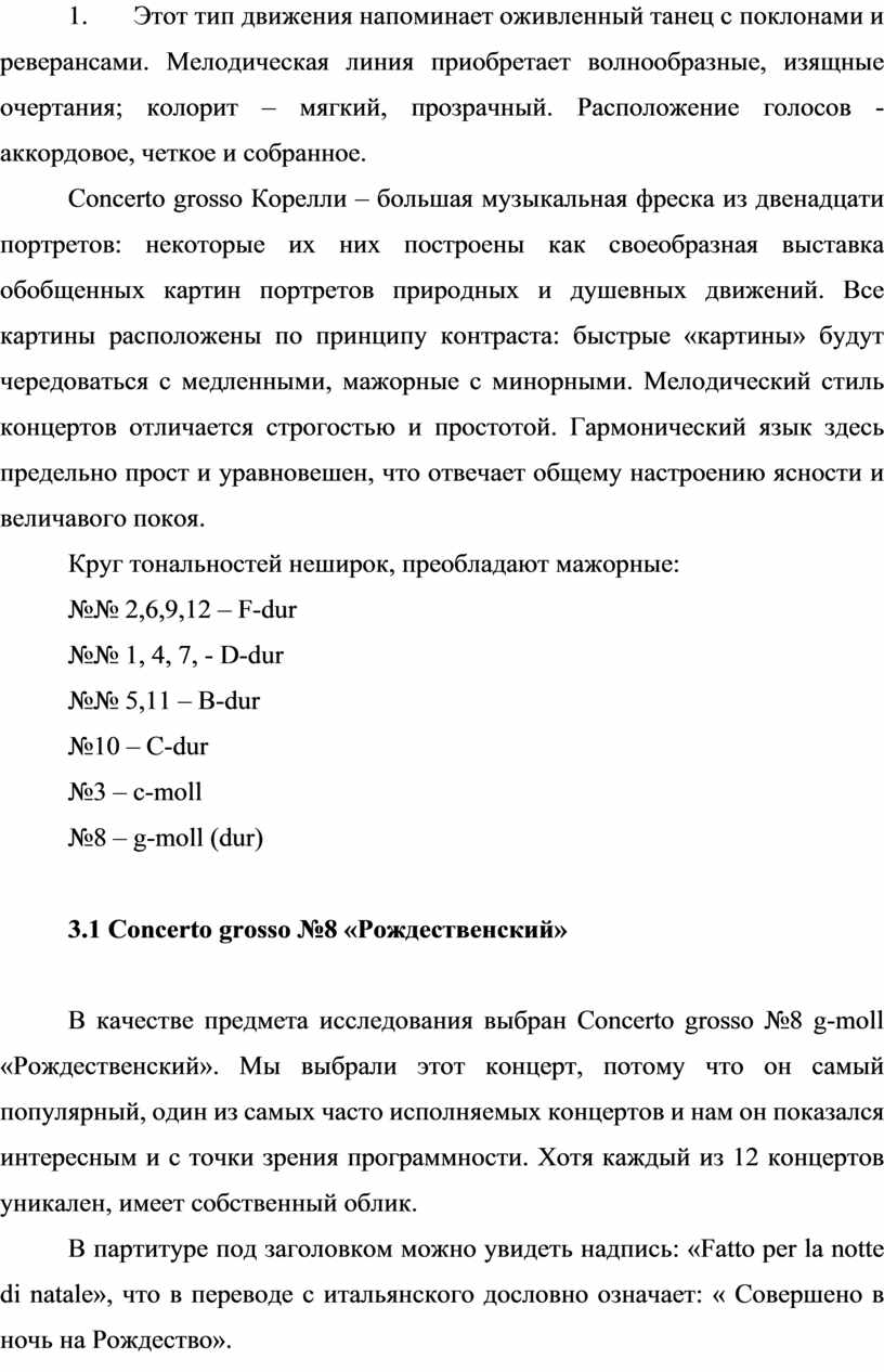 В качестве предмета исследования выбран Concerto grosso №8 g-moll «Рождественский». Мы выбрали этот концерт, потому что он самый популярный, один из самых часто исполняемых концертов и нам он показался интересным и с точки зрения программности. Хотя каждый из 12 концертов уникален, имеет собственный облик.