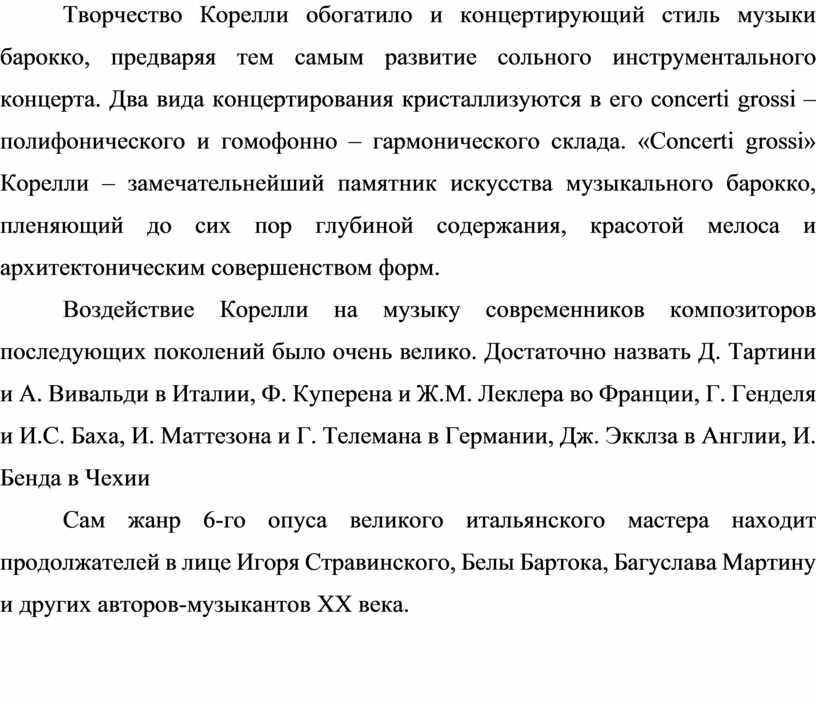 Творчество Корелли обогатило и концертирующий стиль музыки барокко, предваряя тем самым развитие сольного инструментального концерта. Два вида концертирования кристаллизуются в его concerti grossi – полифонического и гомофонно – гармонического склада. «Concerti grossi» Корелли – замечательнейший памятник искусства музыкального барокко, пленяющий до сих пор глубиной содержания, красотой мелоса и архитектоническим совершенством форм.
