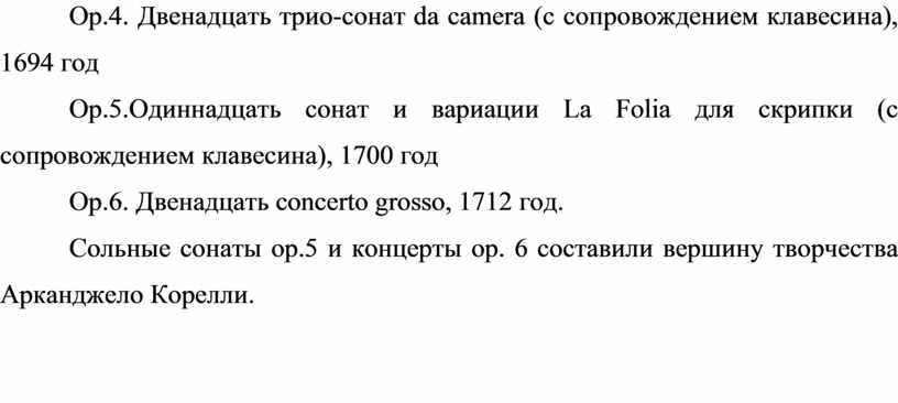 Сольные сонаты ор.5 и концерты ор. 6 составили вершину творчества Арканджело Корелли.