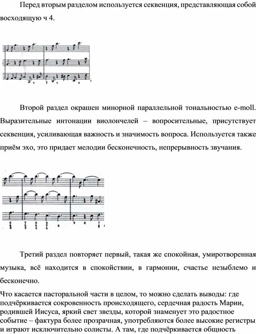 Что касается пасторальной части в целом, то можно сделать выводы: где подчёркивается сокровенность происходящего, сердечная радость Марии, родившей Иисуса, яркий свет звезды, которой знаменует это радостное событие – фактура более прозрачная, употребляются более высокие регистры и играют исключительно солисты. А там, где подчёркивается общность праздника, вступает группа grosso в каденционных зонах, а также во вступительных разделах - фактура приобретает здесь плотность и мощность звучания.
