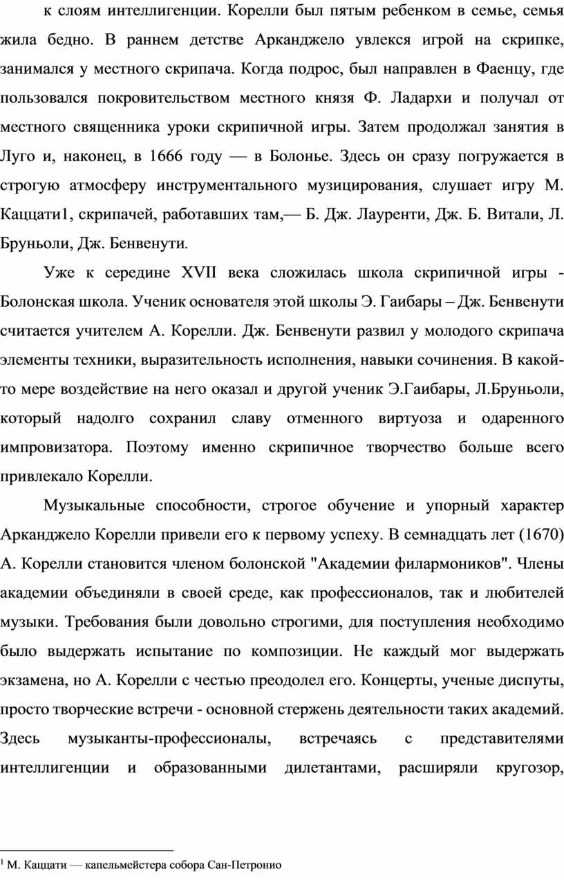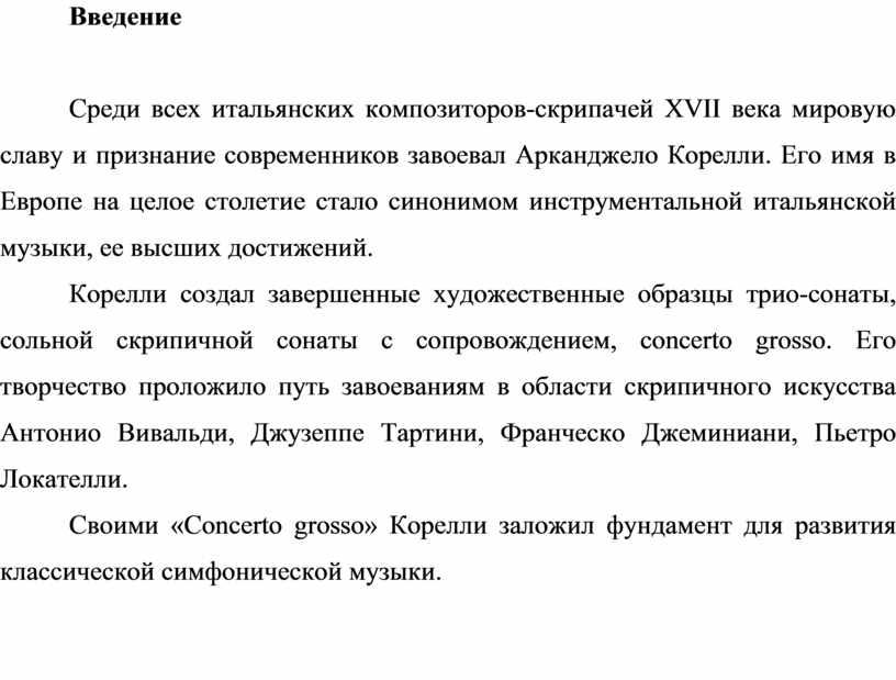 Арканджело Корелли можно заслуженно назвать основоположником итальянской скрипичной школы. XVII – н. XVIII века. Опираясь на народные традиции, Корелли обобщил лучшие достижения итальянской скрипичной музыки XVII в., заложил своим творчеством основы предклассического стиля в скрипичном искусстве.