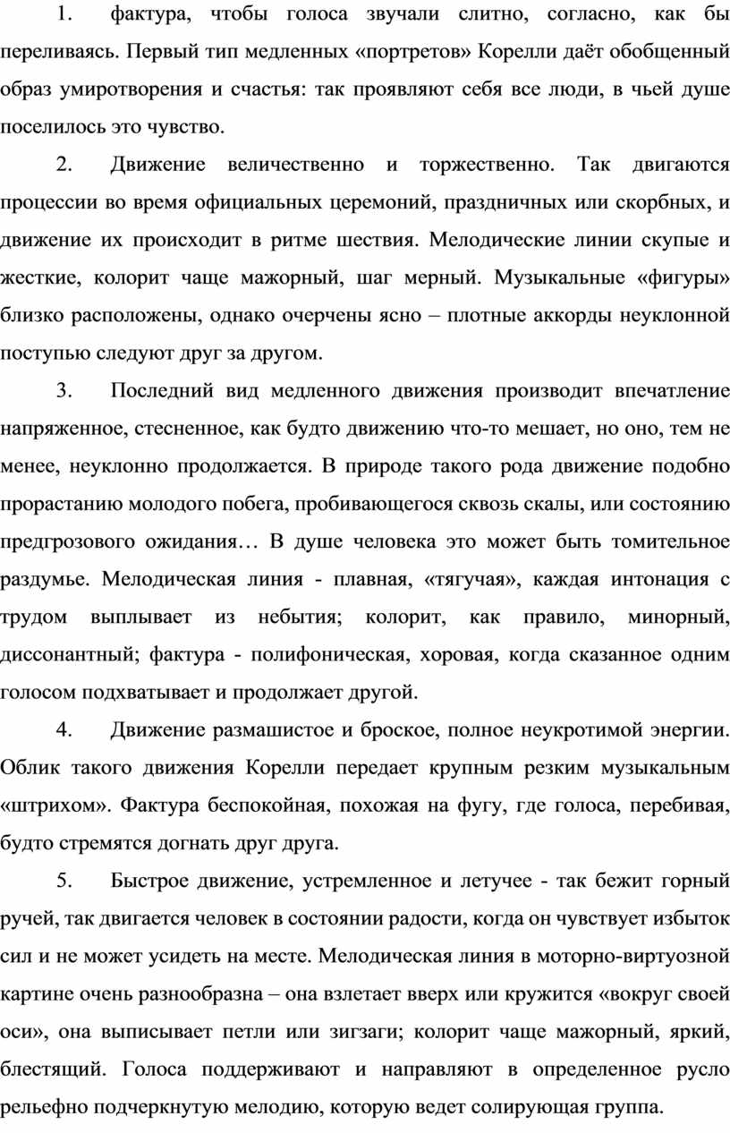 1. Медленный темп. Он связан с чувством покоя и умиротворения, когда движение порой едва заметно. Мелодическая линия мягкая, колорит мажорный, ровный и ясный. Для ровности колорита подойдёт гомофонная фактура, чтобы голоса звучали слитно, согласно, как бы переливаясь. Первый тип медленных «портретов» Корелли даёт обобщенный образ умиротворения и счастья: так проявляют себя все люди, в чьей душе поселилось это чувство.