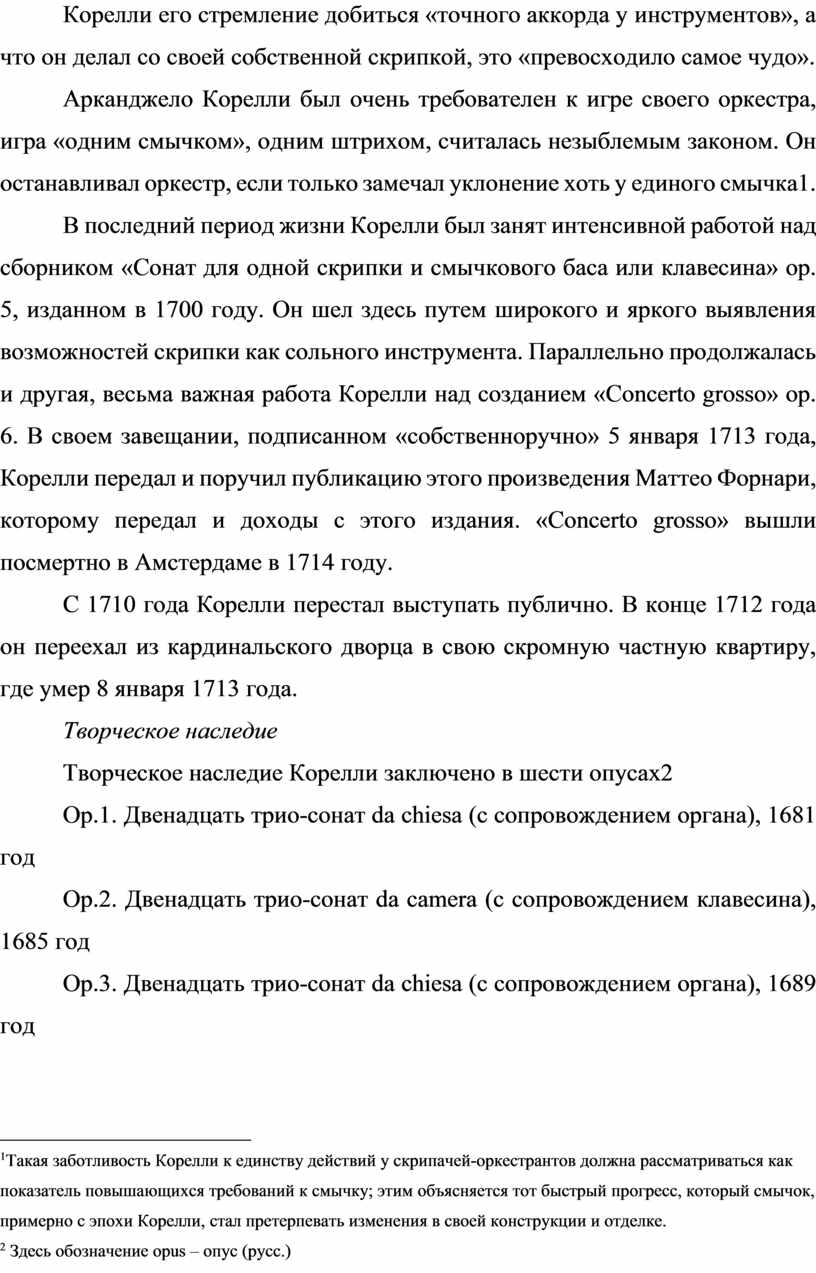 [5]Такая заботливость Корелли к единству действий у скрипачей-оркестрантов должна рассматриваться как показатель повышающихся требований к смычку; этим объясняется тот быстрый прогресс, который смычок, примерно с эпохи Корелли, стал претерпевать изменения в своей конструкции и отделке.