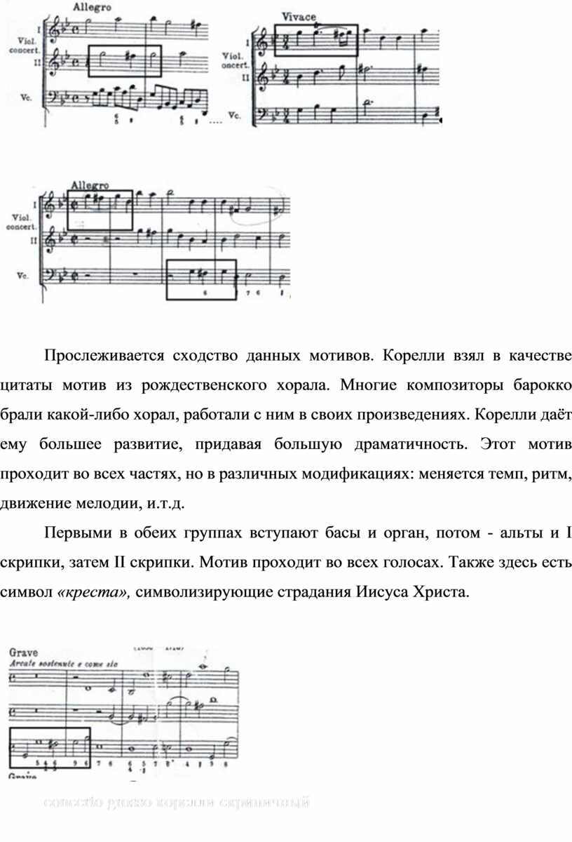Прослеживается сходство данных мотивов. Корелли взял в качестве цитаты мотив из рождественского хорала. Многие композиторы барокко брали какой-либо хорал, работали с ним в своих произведениях. Корелли даёт ему большее развитие, придавая большую драматичность. Этот мотив проходит во всех частях, но в различных модификациях: меняется темп, ритм, движение мелодии, и.т.д.
