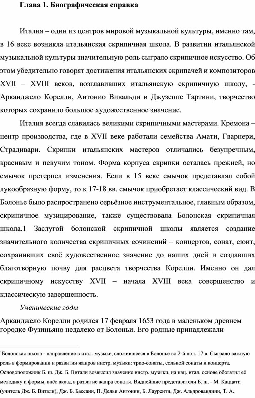 Италия – один из центров мировой музыкальной культуры, именно там, в 16 веке возникла итальянская скрипичная школа. В развитии итальянской музыкальной культуры значительную роль сыграло скрипичное искусство. Об этом убедительно говорят достижения итальянских скрипачей и композиторов XVII – XVIII веков, возглавивших итальянскую скрипичную школу, - Арканджело Корелли, Антонио Вивальди и Джузеппе Тартини, творчество которых сохранило большое художественное значение.