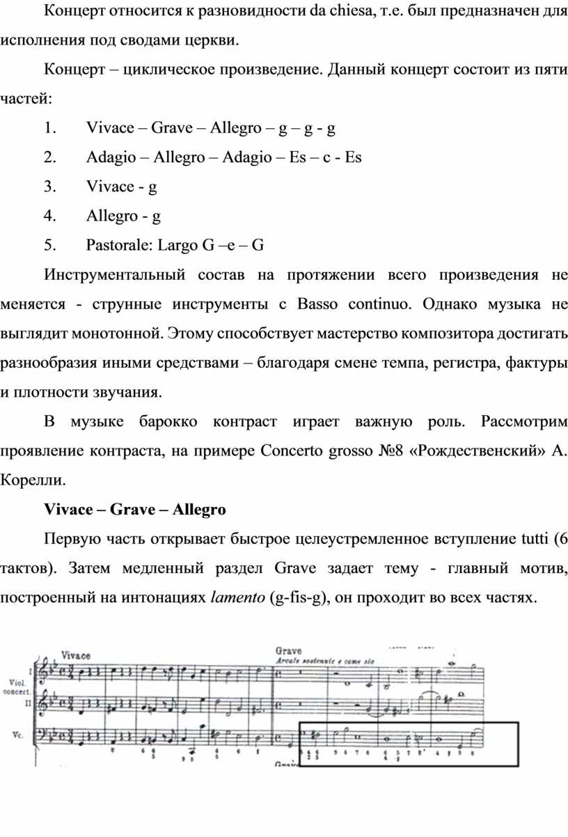 В музыке барокко контраст играет важную роль. Рассмотрим проявление контраста, на примере Concerto grosso №8 «Рождественский» А. Корелли.