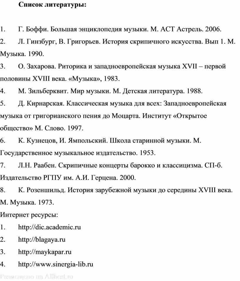 7. Л.Н. Раабен. Скрипичные концерты барокко и классицизма. СП-б. Издательство РГПУ им. А.И. Герцена. 2000.