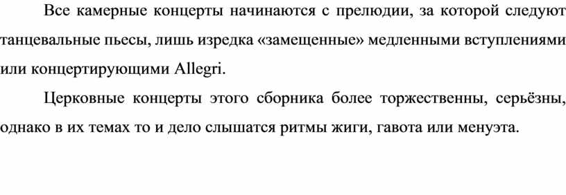 Впрочем, концерты da camera и da chiesa иногда как бы «обмениваются» жанровыми признаками. В камерных циклах посреди «партитных танцев», являются Allegro, Andante, Adagio.