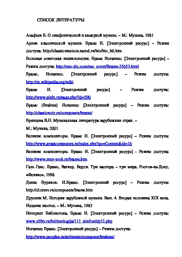 ресурс] – Режим доступа: http://cheloveknauka.com/iogannesbramsЭнциклопедия Кольера. Брамс И. [Электронный ресурс] – Режим доступа:
