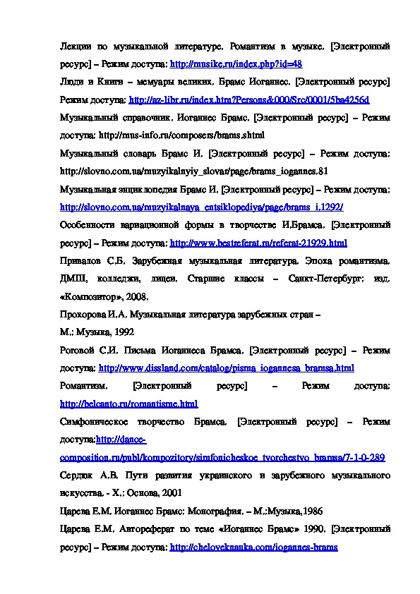 http://www.peoples.ru/art/music/composer/brahms/Лекции по музыкальной литературе. Романтизм в музыке. [Электронный