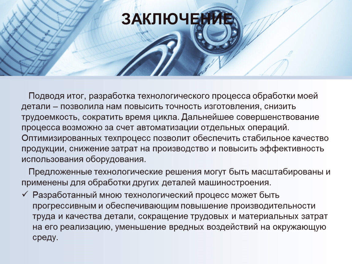 Подводя итог, разработка технологического процесса обработки моей детали – позволила нам повысить точность изготовления, снизить трудоемкость, сократить время цикла. Дальнейшее совершенствование процесса возможно за счет автоматизации отдельных операций. Оптимизированных техпроцесс позволит обеспечить стабильное качество продукции, снижение затрат на производство и повысить эффективность использования оборудования.