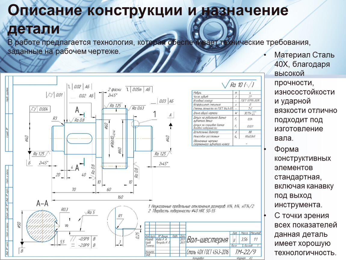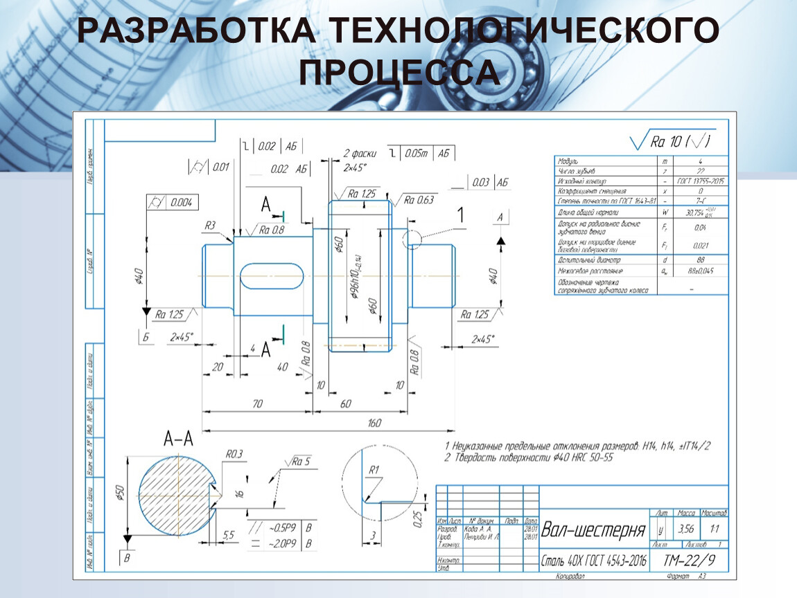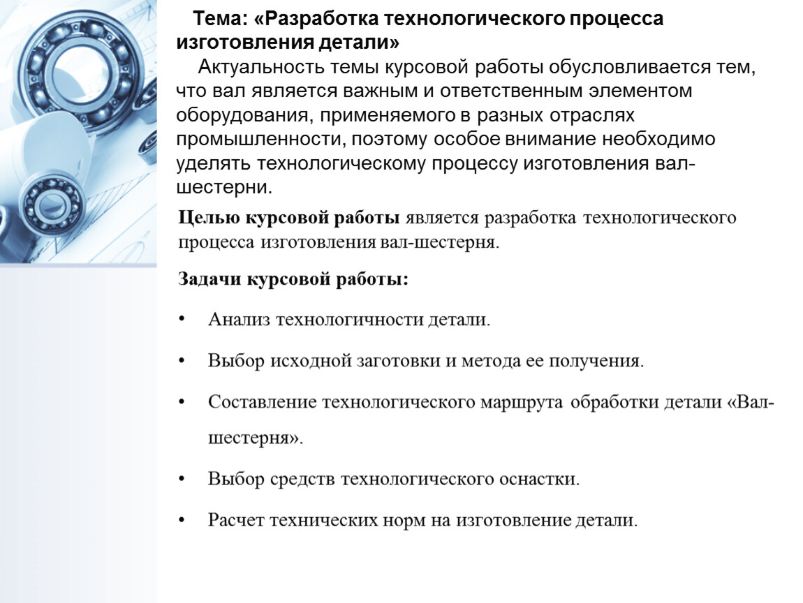 Тема: «Разработка технологического процесса изготовления детали» Актуальность темы курсовой работы обусловливается тем, что вал является важным и ответственным элементом оборудования, применяемого в разных отраслях промышленности, поэтому особое внимание необходимо уделять технологическому процессу изготовления вал-шестерни.