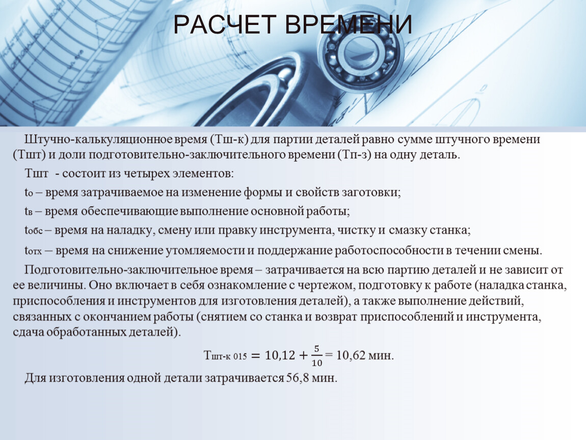 Штучно-калькуляционное время (Тш-к) для партии деталей равно сумме штучного времени (Тшт) и доли подготовительно-заключительного времени (Тп-з) на одну деталь.