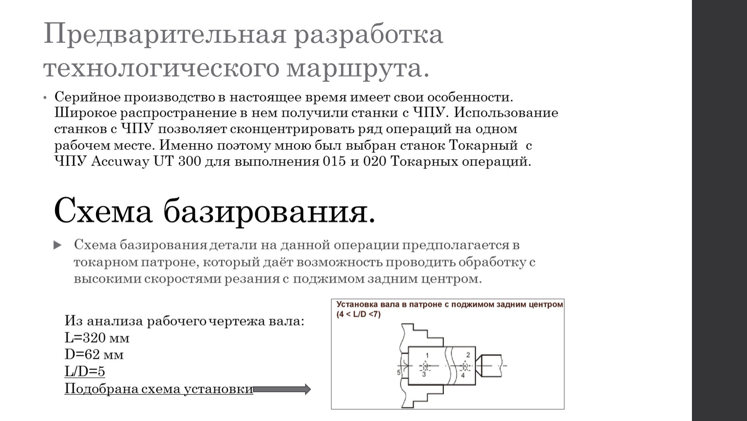Базирование и закрепление данного вала будет проводиться по типовой схеме установки. С одной стороны используем самоцентрирующее приспособление, типа трехкулачкового патрона на токарных операциях и поводкового патрона на шлифовальных. С другой стороны будем проводить поджим задним центром. Использование дополнительной опоры необязательно.