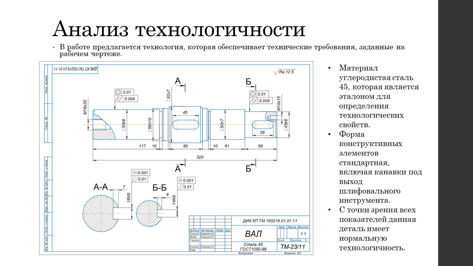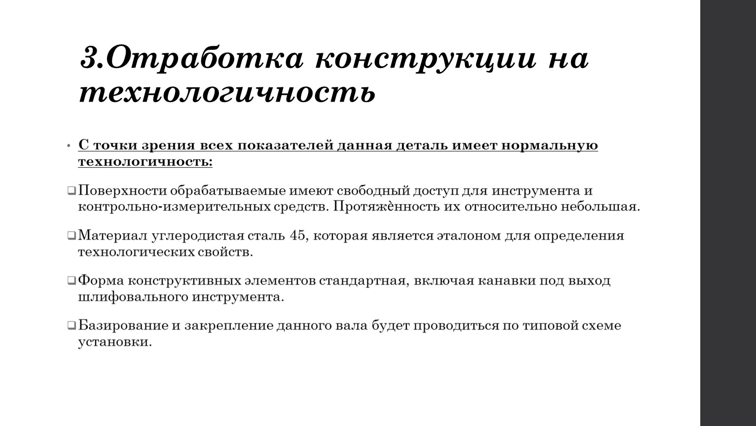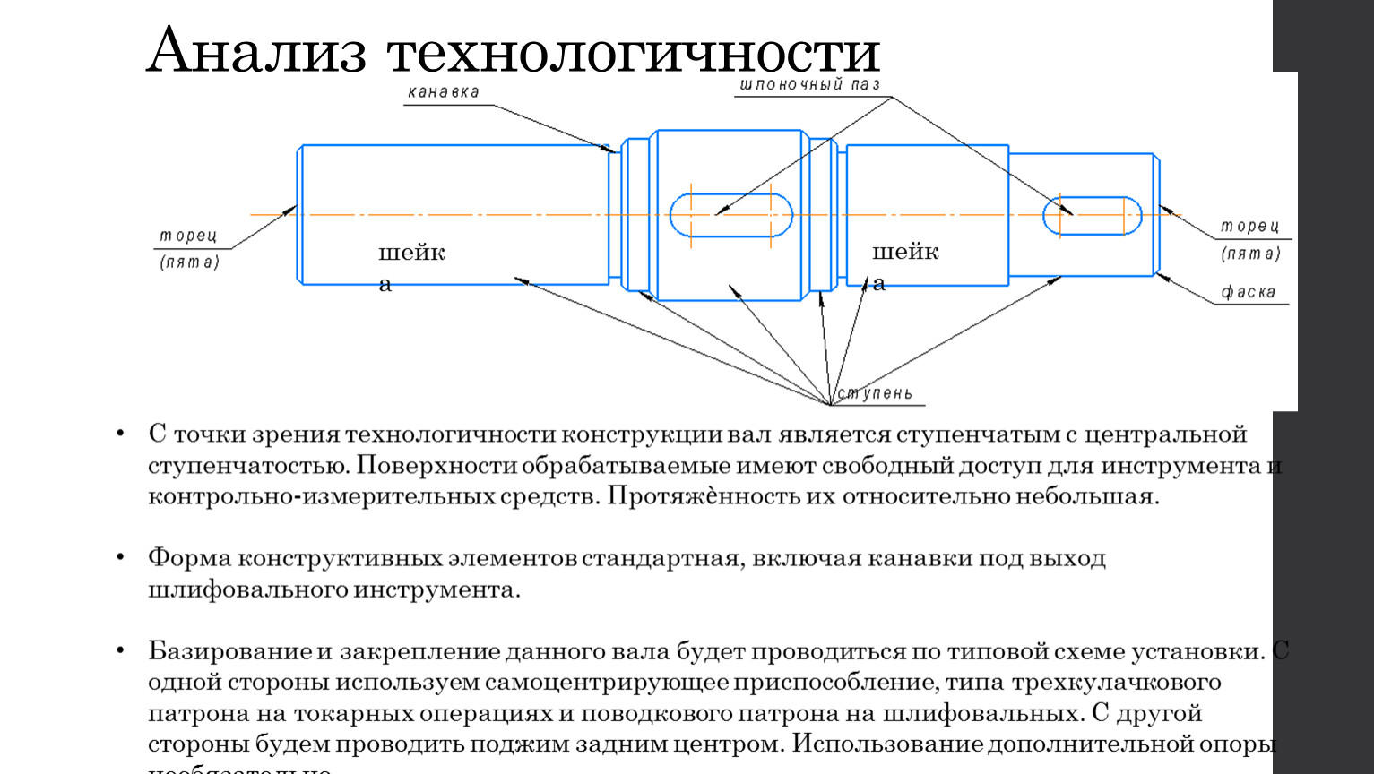 С точки зрения технологичности конструкции вал является ступенчатым с центральной ступенчатостью. Поверхности обрабатываемые имеют свободный доступ для инструмента и контрольно-измерительных средств. Протяжѐнность их относительно небольшая.